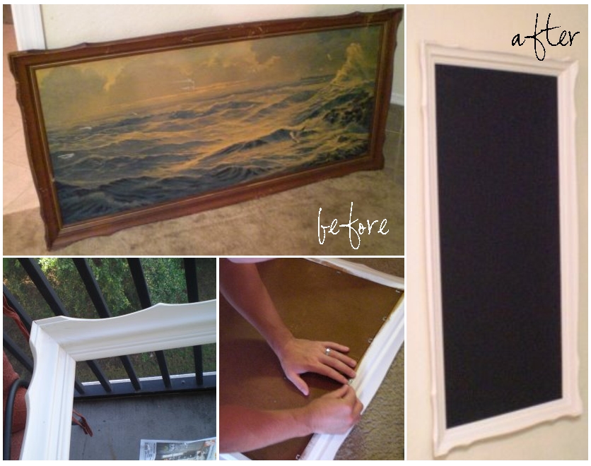 You can see in the before picture, I found this picture of the ocean. The painting was held together by bendable staples, so we opened them all up and took apart the three pieces – the frame, which we painted white, the wood backing, which we painted with chalkboard paint & the painting paper itself, which got tossed in the trash.