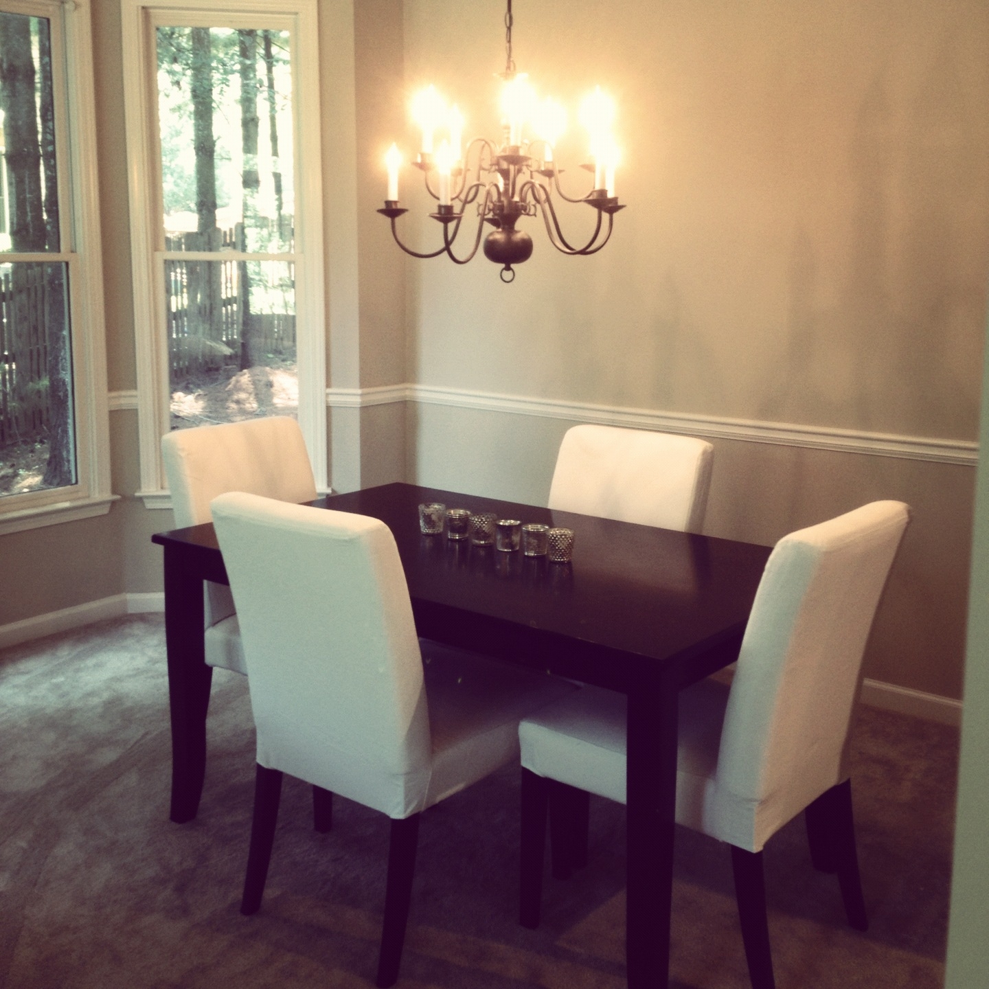 We are slowly but surely making progress on the house. Hubby tore up the tile in the living room the weekend before we moved in. I know, it was a hard decision, but at the end of the day it was just so impractical. And with all the brick & stone in the fireplace, it looked like a rock garden in here. We have carpet for now which wasn’t my first choice but it was affordable, practical & pretty darn cozy.