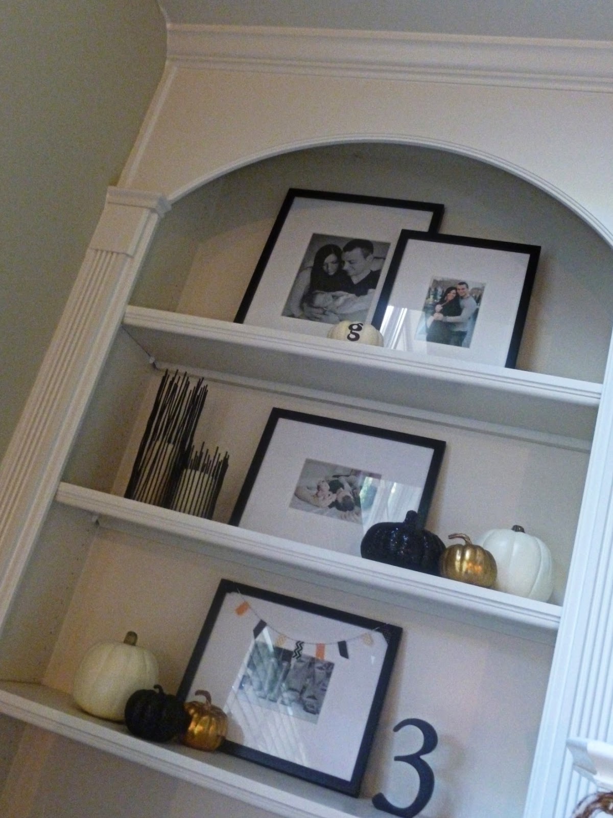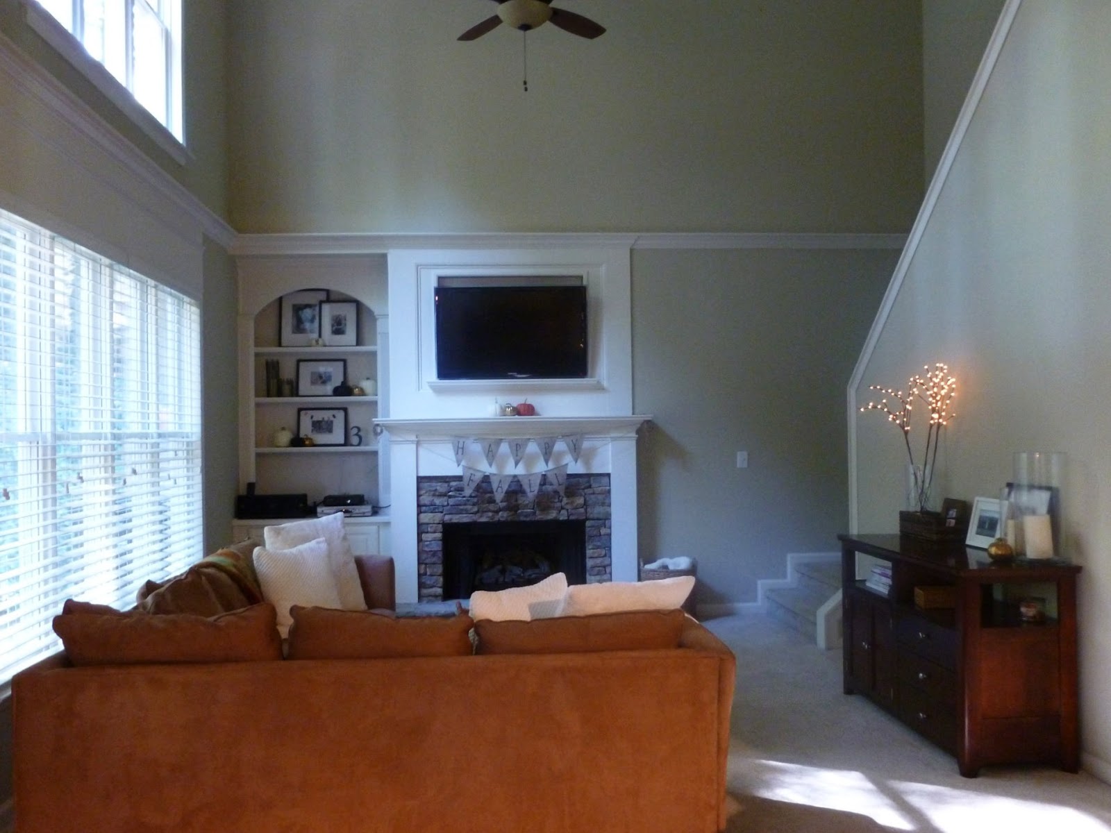 This is the two story family room that I literally cannot figure out how to decorate. I love the built in shelving… but the giant stairwell wall to the right may remain bare forever.