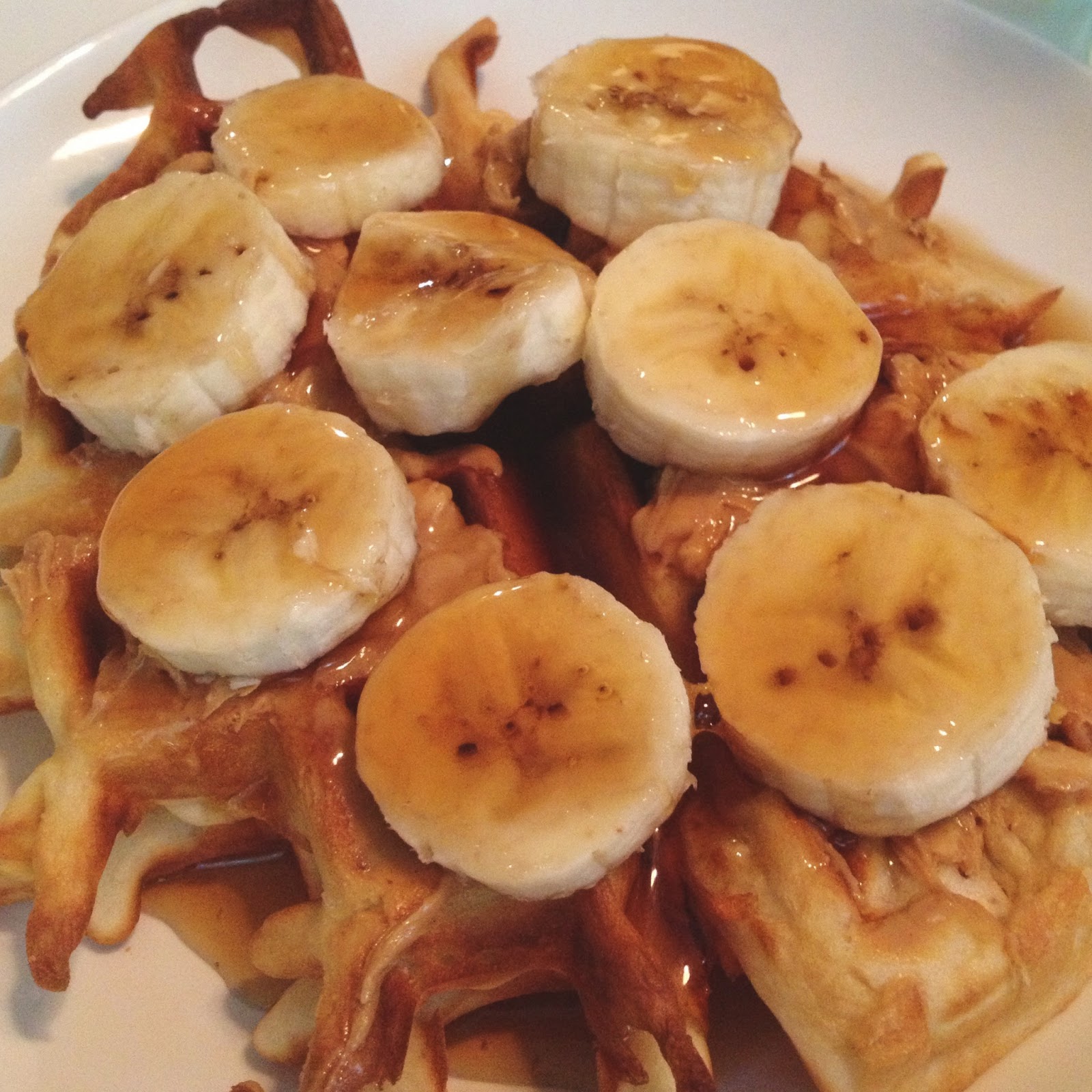 Award for the most unique waffle topping goes to my husband, who loaded it up with crunchy peanut butter, banana slices & syrup.