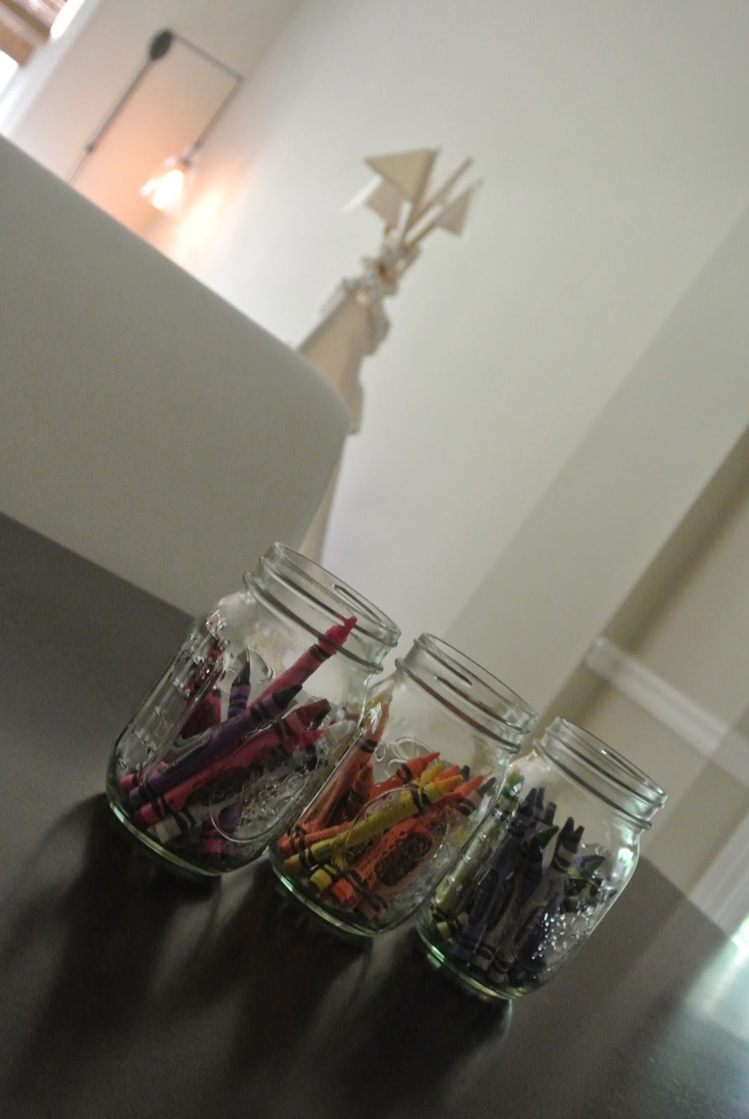 A few mason jars filled with crayons make for a fun playroom feel for a simple dining room table centerpiece. I know, I’ll be kicking myself in the ass the day Harper turns one of the white slipcovers into a canvas. Wait for it.
