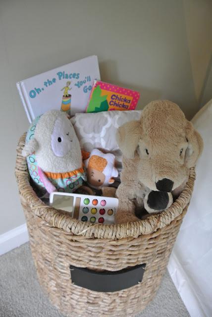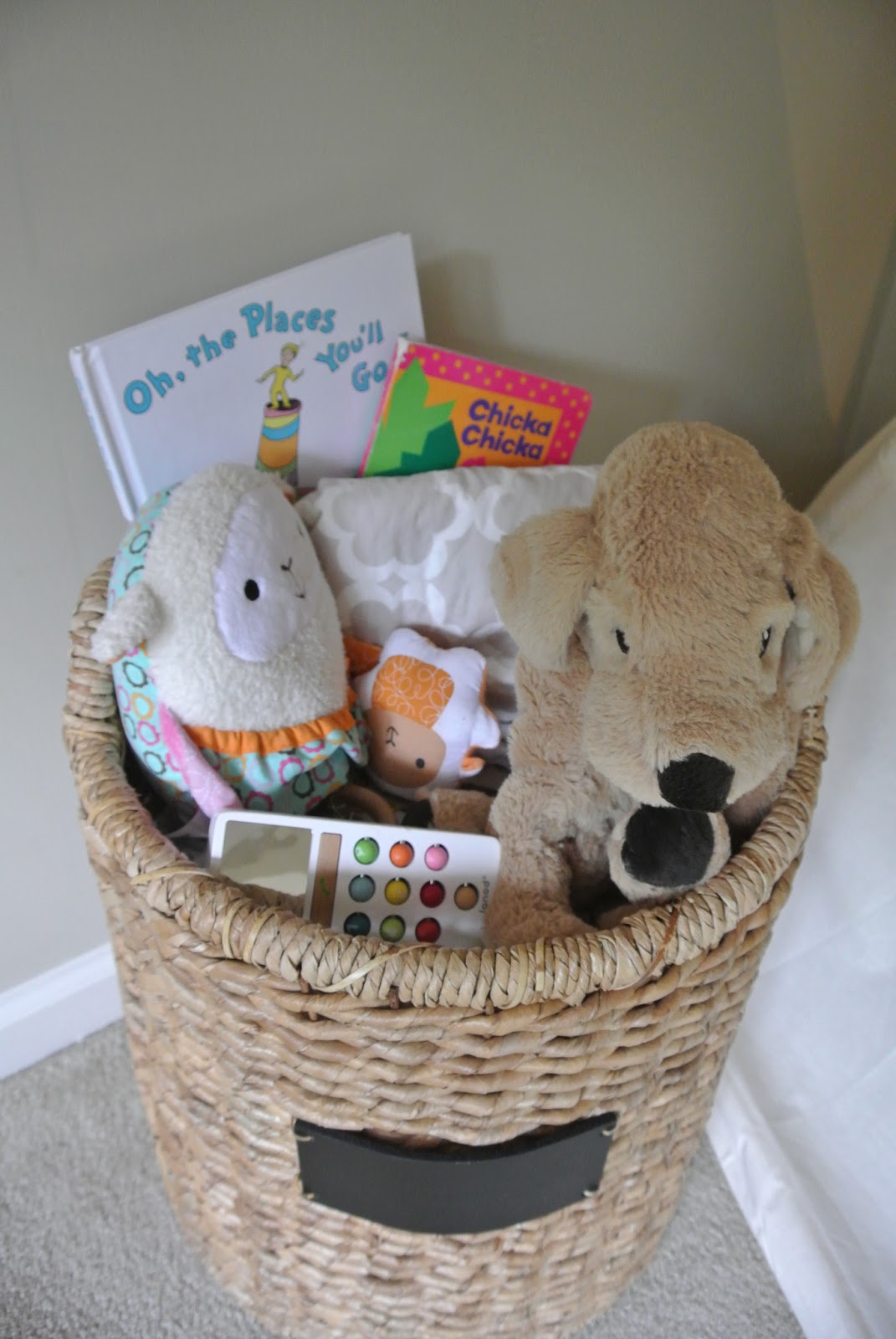 Harper’s teepee & a large basket house most of her toys, as well as small tubs that we slide under each of the two chairs.