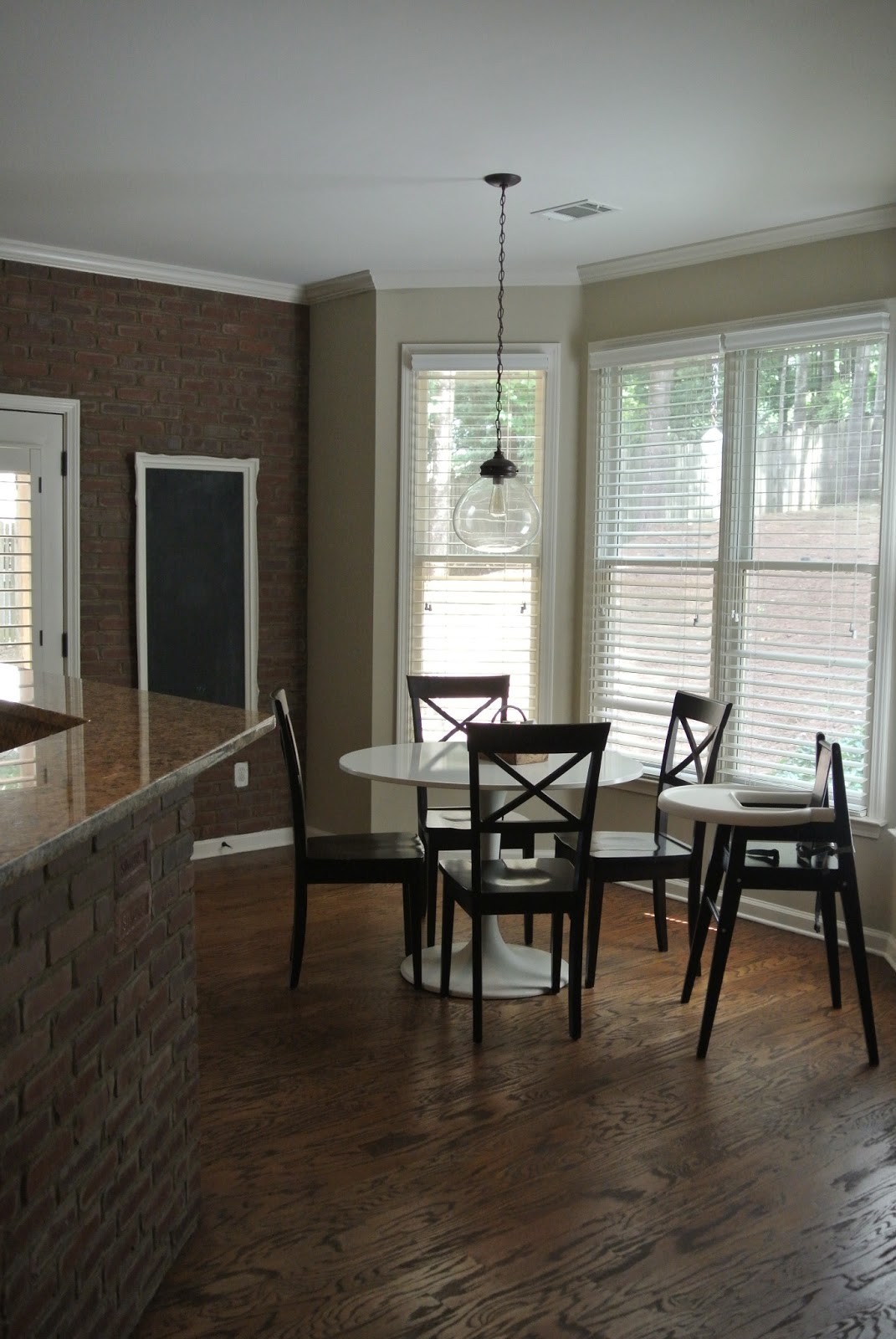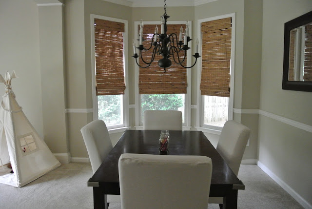 We filled the room with a pair of durable chairs, a thrifted dining room table & Ikea dining room chairs with washable slipcovers. We hung some pendant lights, bamboo blinds & a large mirror in the dining room. The mirror was just a cheap Home Goods mirror, meant to be hung vertically, but was just the right size for our space.