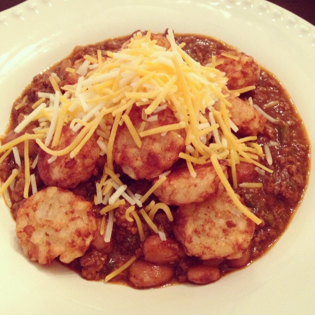 8. Top with tater coins (not tots) and shredded cheddar cheese