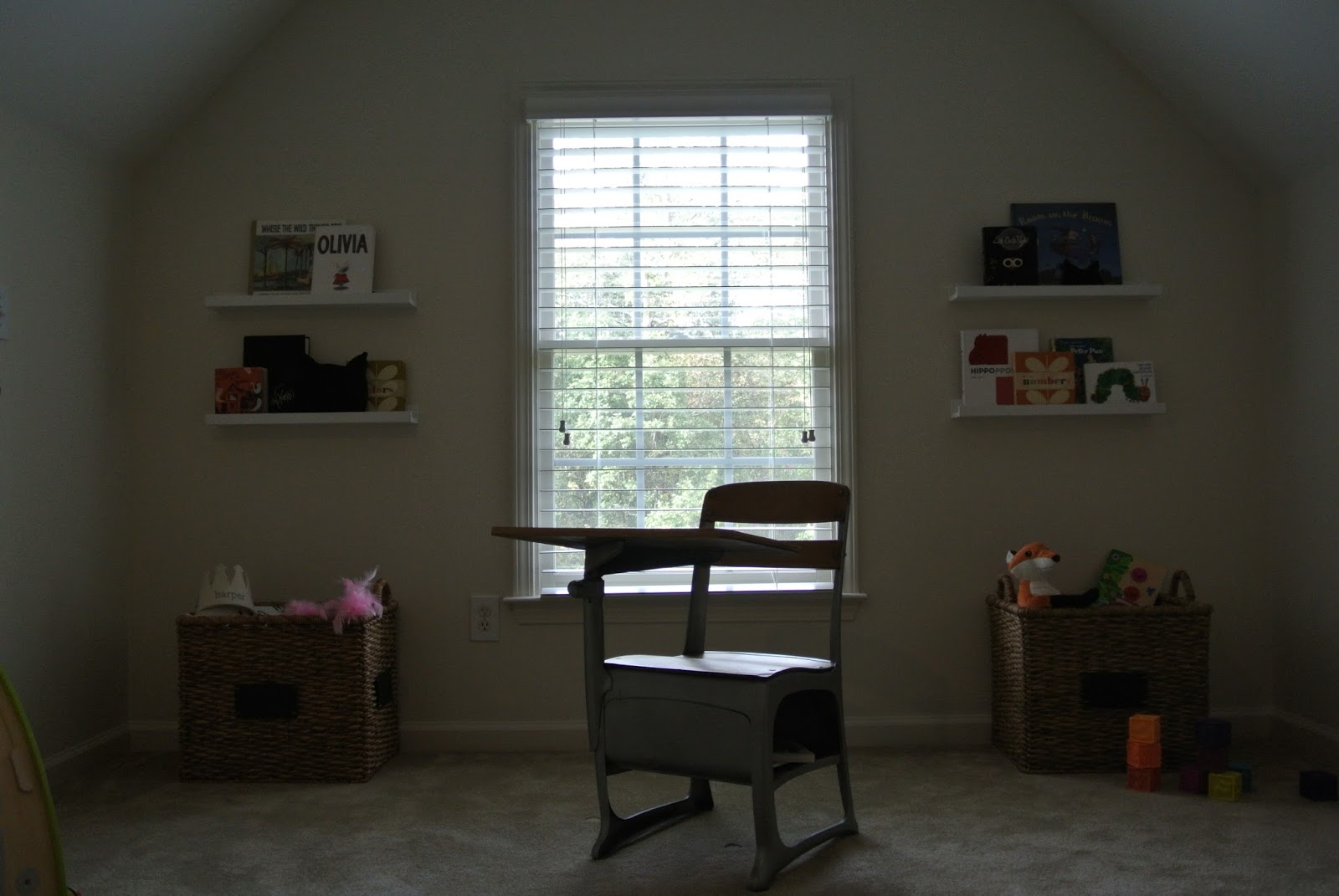 Of course this room isn’t normally so clean, but it really just takes a minute to pick up since everything just gets thrown in baskets. For the most part, Harper likes to sit at her little desk that Brandon refinished (you can see the before picture here) & color. The little cubby in the bottom holds her coloring books, notebooks, crayons & stickers. Stickers. Why did I let her have stickers? She stuck them to the cat this morning.