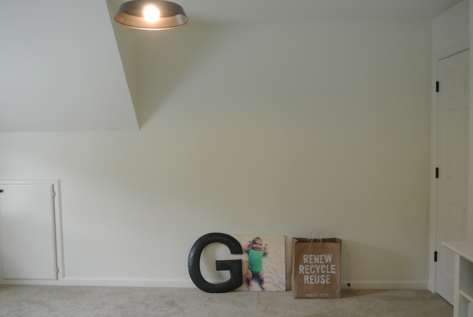 This wall, which is where my desk used to be, is now going to have a pull out couch & will have a few fun canvases on the wall above it. You can see one there, which used to be in the bathroom & there are a few new ones on the way. I also got this giant metal G & think it should live up there as well. On top of that, I am still on the hunt for a cute desk chair, a large rug & maybe some fun curtains.