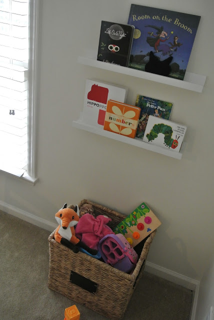 I got these two baskets on sale at Target a while back, they hold all of Harper’s toys. The little bookshelves are form Ikea & once we know baby #2’s name, I am hoping to hang little monograms above each set of books.