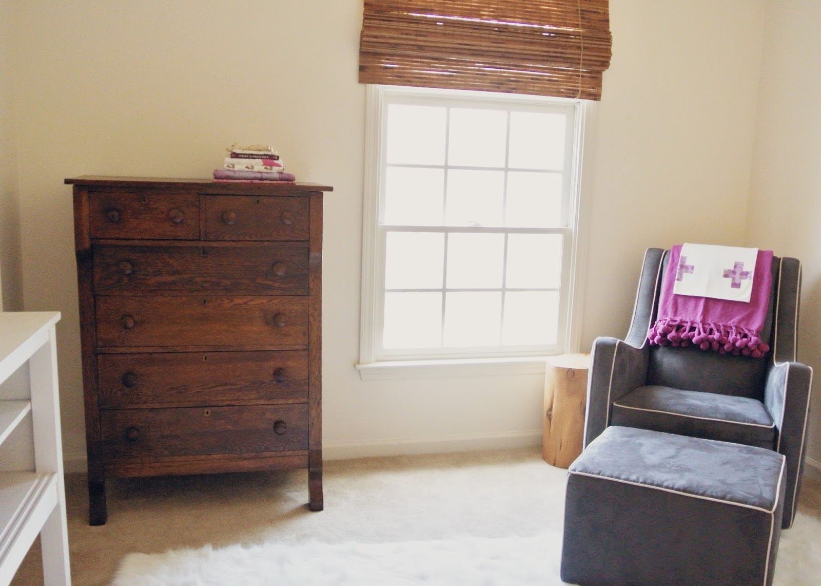 Over the weekend we found an antique dresser on craigslist, so excited to finally have that checked off our list so I can start organizing baby clothes!! We need to touch up some of the scratches & secure it to the wall still for safety, but overall it is really sturdy & in great shape considering it is so old, but I love how much character it brings to the room. It’s a bit darker than I wanted, so I’m thinking the stump side table will have to go & maybe I can replace it with something white or gold instead. I will be on the hunt for some new knobs once again, which I hope will lighten it all up a little. No paint debate on this baby. 😉