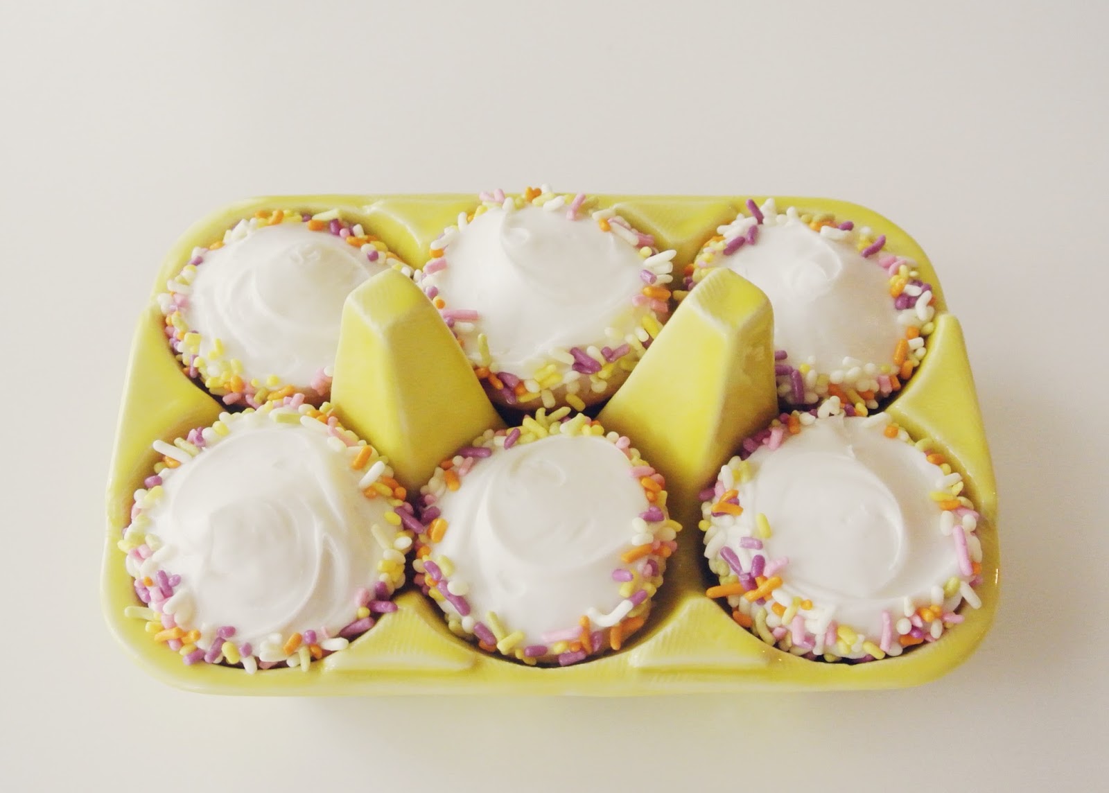 I have been obsessed with egg crates for years, I bought one for our first Easter after we got married & love using it every year! Lately they are popping up everywhere, in lots of shapes & colors so I was prompted to find more uses for them because I love them so much. So of course, mini cupcakes, perfect for an Easter Sunday dessert display or a hostess gift!