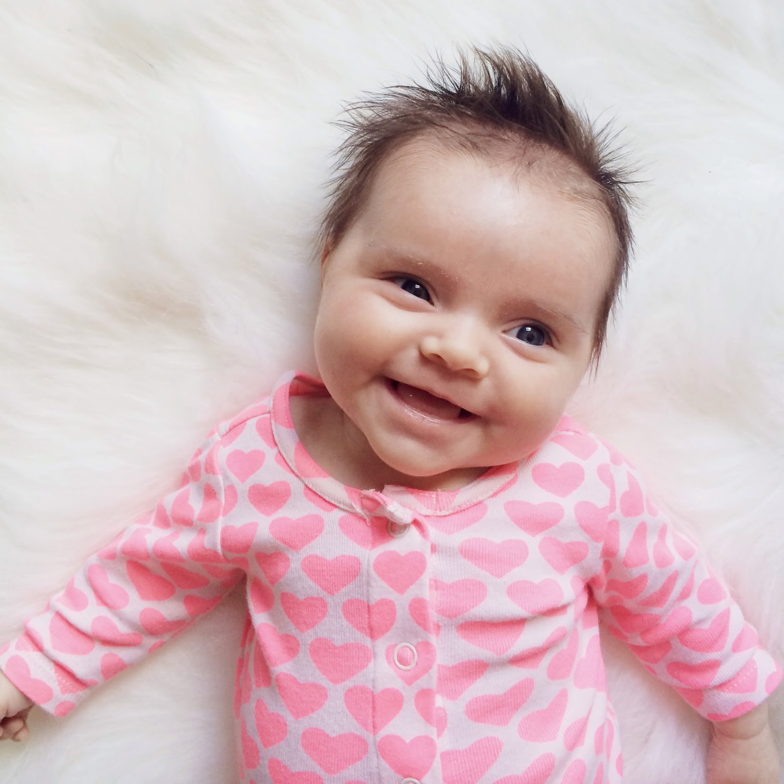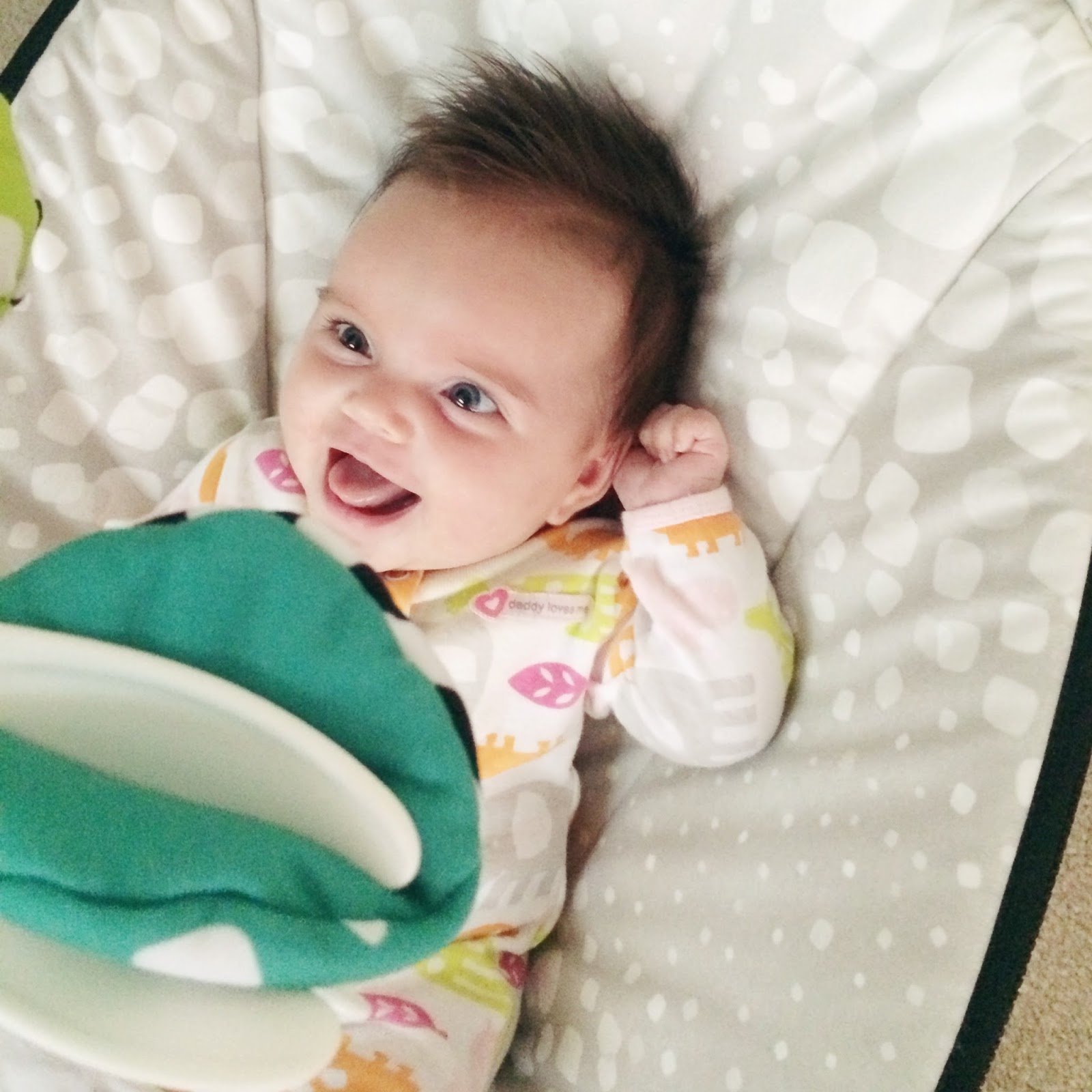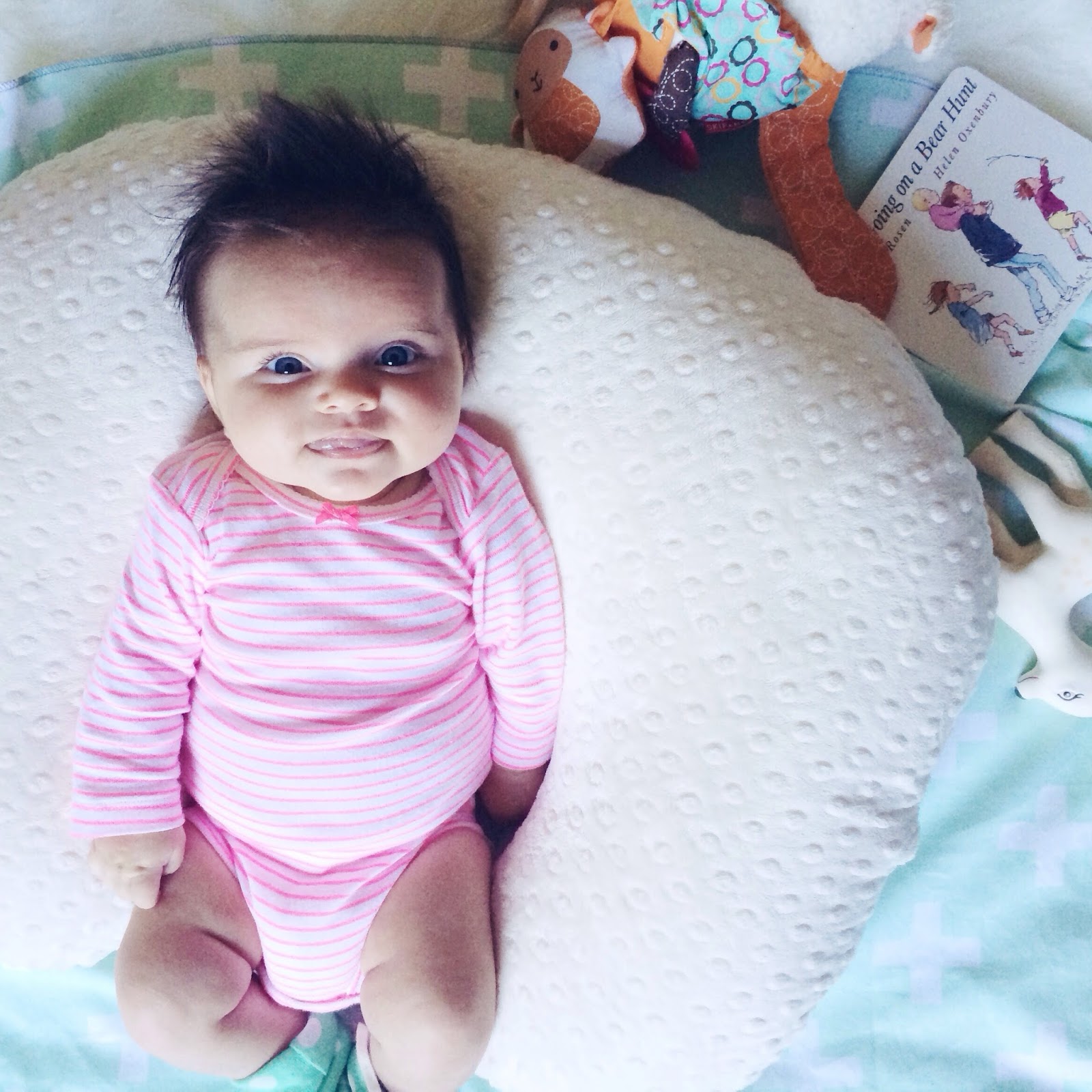 Sleep is still a mystery. Her schedule is pretty consistent each day, give or take a nap or feeding, her bath time is always at 7pm, and she is in her crib by 7:45/8pm. There have been a few times in the last two weeks where she has slept until 4am, but other nights she is awake at 1 and will not fall back asleep unless I feed her. Sometimes that is the only time she will wake, other times she will be up again by 2 and wide awake until 4 or 5. And like clockwork, this kid is awake every morning at 6. I am thankful that we seem to be making a little progress, but still just stumped as to why it is so inconsistent. Babies just seem to do whatever they want! 😉