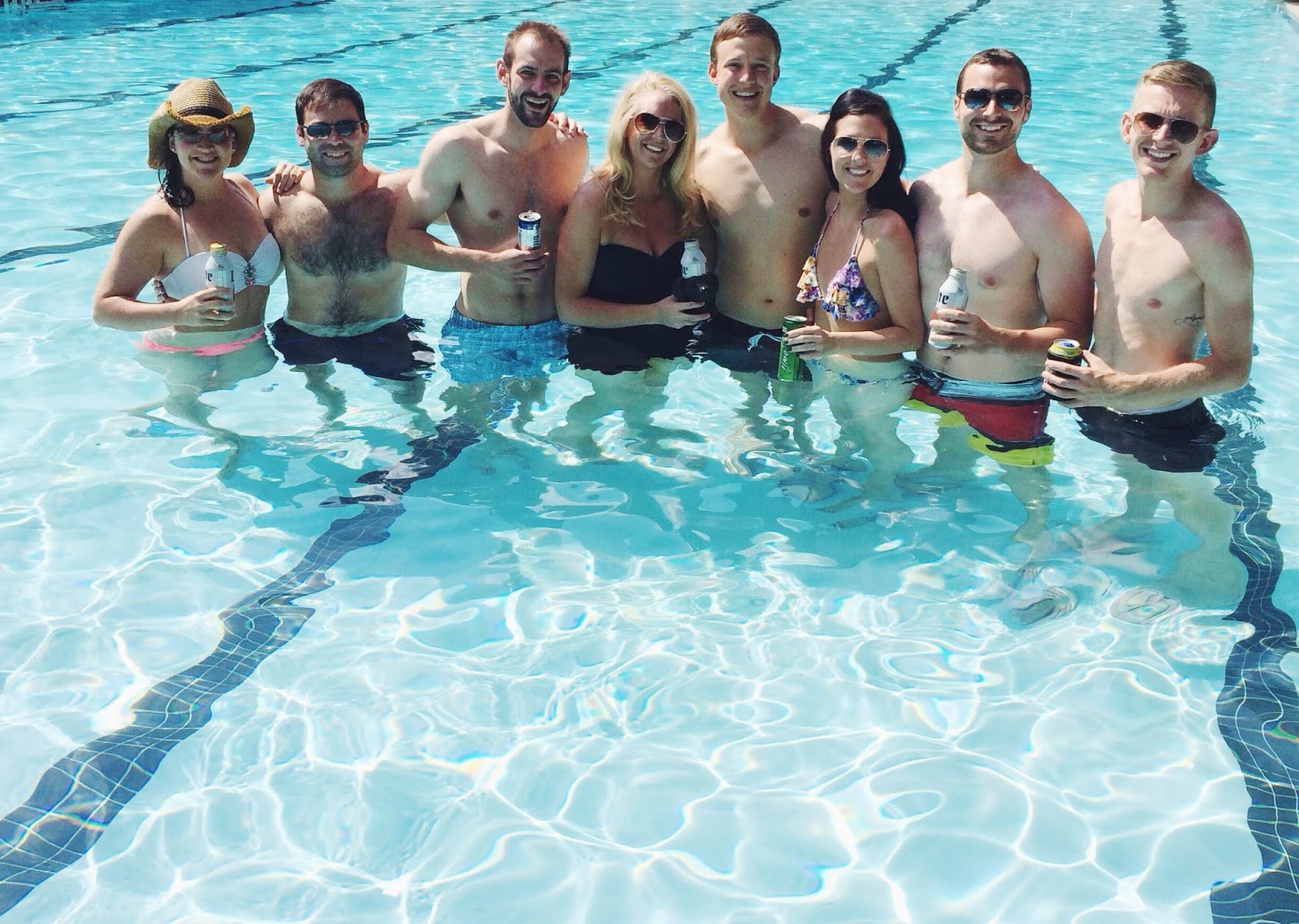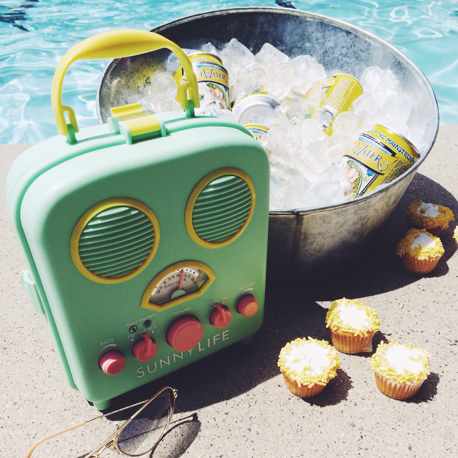 We had a few birthdays to celebrate this weekend & what better way than a little end of summer pool party! School starts this week & we have something going on every weekend for the next few months, so we decided to make the most of a 90 degree afternoon by heading to the pool. We left the girls home with our babysitter because it was too hot for them & they don’t last very long anyway. I got this fun beach radio a few months ago (found on sale here) & was inspired by the colors for a fun party setup. We had a few tubs of drinks on ice & I made a batch of mini ice-cream lemon cupcakes (a twist on this recipe) so we could sing Happy Birthday poolside to the birthday boy & girl! 😉 Always a fun time celebrating the people we love!