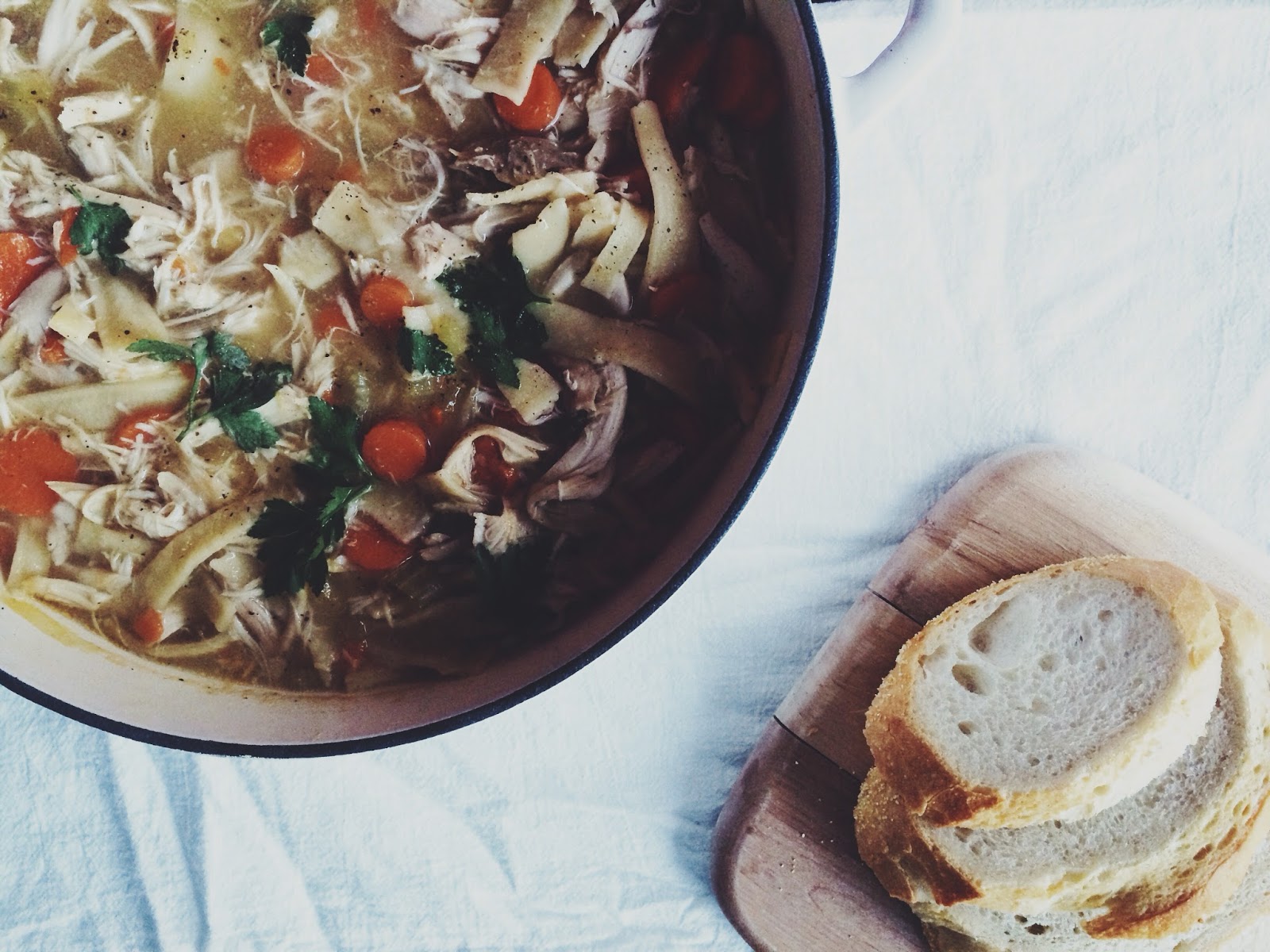 For the soup, in a large stockpot on the stove (or can be done in a crockpot, just takes quite a bit longer), bring two large boxes of chicken stock + 1 cup of water to a low boil. Add chopped carrots & celery (however much you want) & bring the soup to a simmer. Pull apart two small (or one large) rotisserie chicken, add it to the pot, with salt & pepper to taste. Cook on lowest setting for a few hours to bring out the flavors & make sure that all vegetables become soft. About 30 minutes before serving, add noodles + a few pinches of fresh parsley.