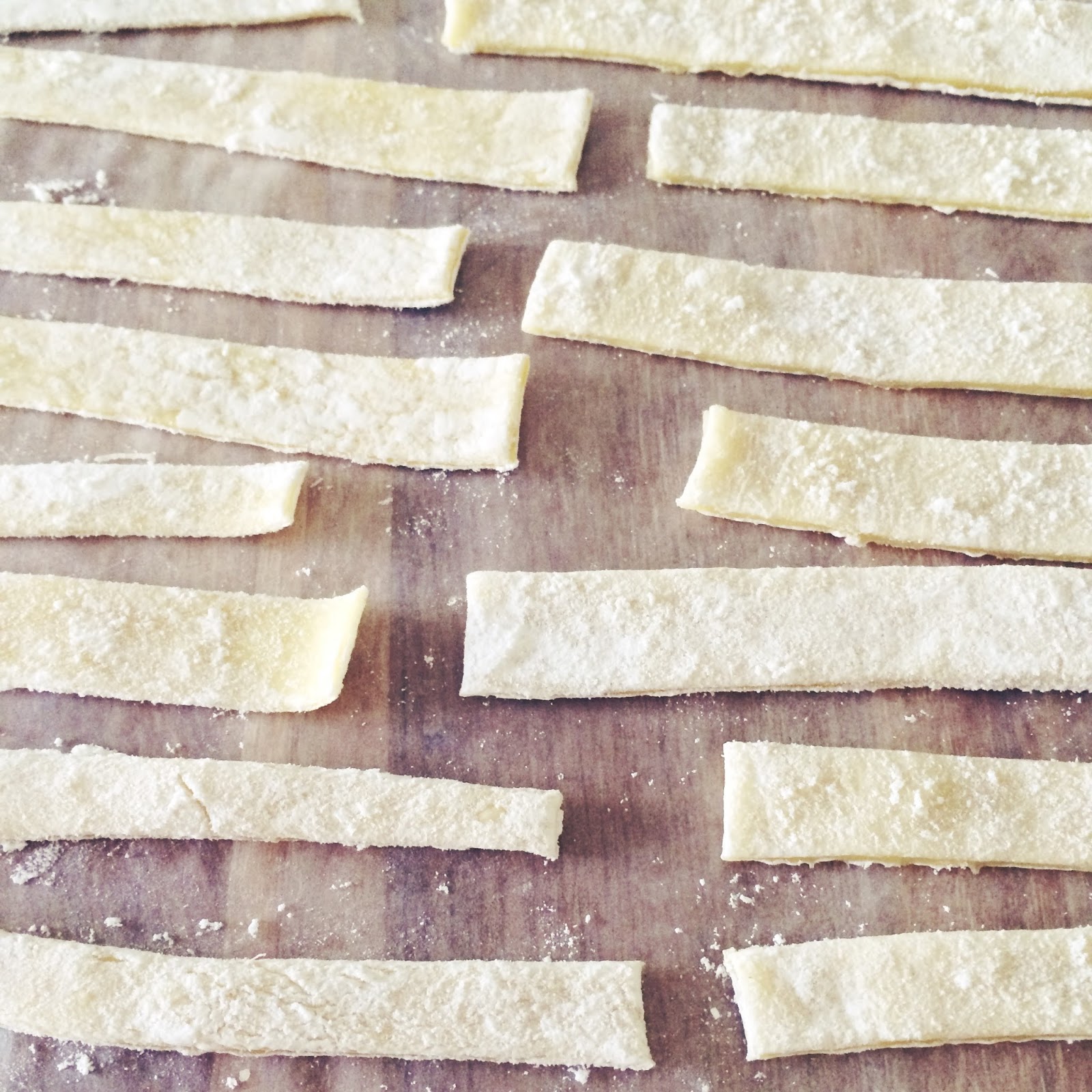 For the noodles, in a large bowl mix together 2 cups of flour + 1 tbsp of salt. Pour in 1/2 cup of water. Add 3 egg yolks + one whole egg. Mix together with a wooden spoon. Add another 1/2 cup of flour & begin mixing together with your hands as the dough forms. Separate your dough into smaller portions, maybe 4-5 with this amount, roll out on your kitchen counter (using lots of flour on your hands, counter & rolling pin). Cut noodles into long thin strips, we always use a pizza cutter but I’m sure there is a proper noodle cutting tool for this? 😉 Separate all noodles & lay them flat on parchment paper to dry out for a few hours (at least 2) before adding to soup.