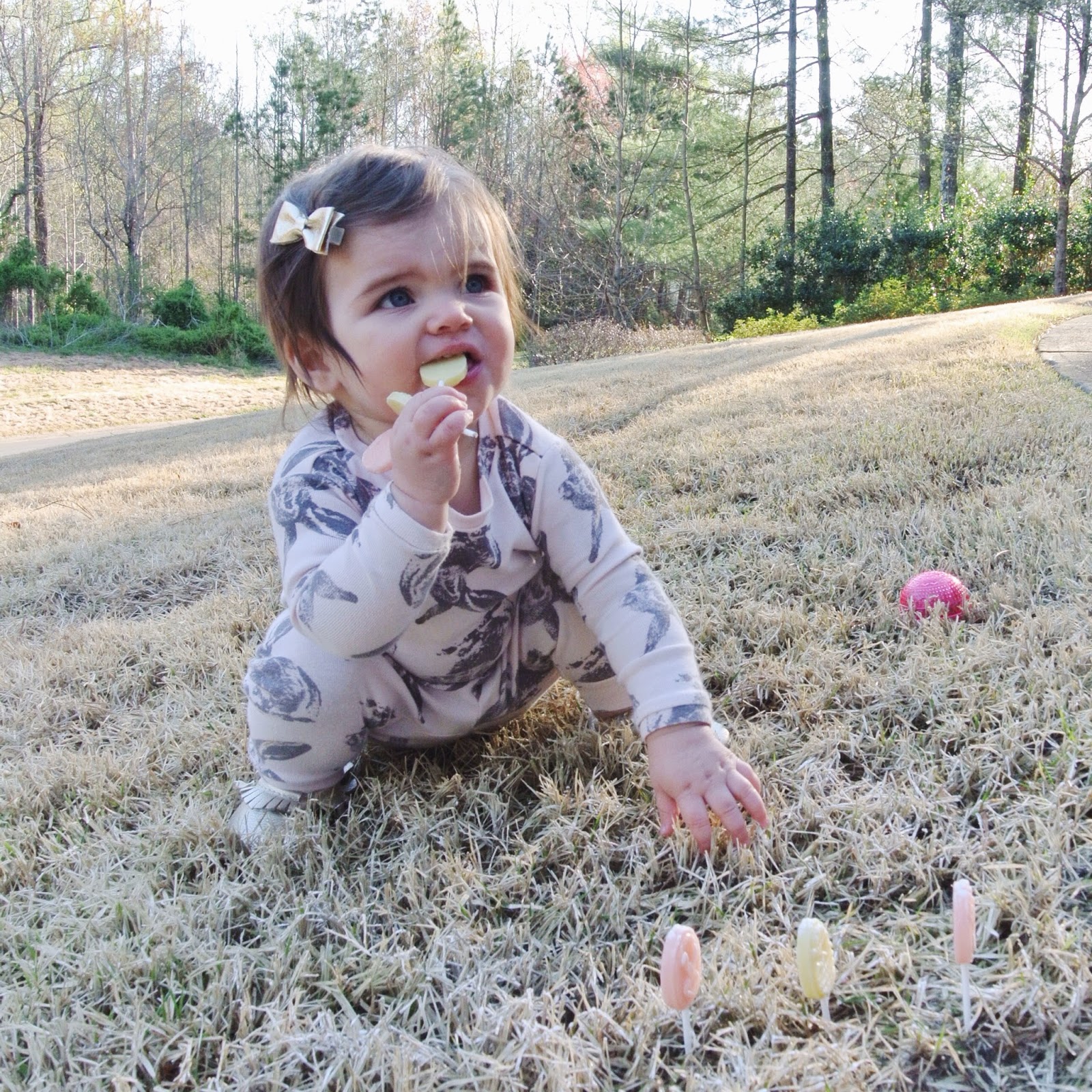 Harper got to participate in the kids portion of the Easter church service for the first time ever, it was adorable & she was so proud of herself. Afterwards, we came home to have brunch with our family & then have the girls do their egg hunt in our backyard. Harper was hopeful that there were m&ms in each egg & Eloise was pumped to see how much grass she could eat! We took yet another family picture, in the same spot every time, which has officially made me start tearing up as I look back on each holiday over the years and see how much our babies have grown. Or in many cases, how much my belly has grown. πŸ˜‰