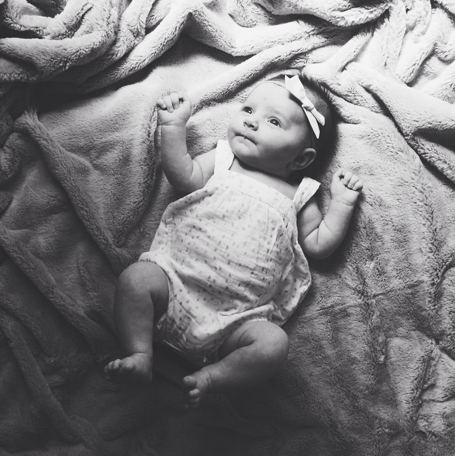 Claire turned a whole six weeks old on Wednesday, with each new day she is looking more & more like baby Harper, which is so cool to see. Her hair seems to be thinning already, most of Harper’s hair fell out by the time she was four months & it seems like hers may follow suit. She is just over 11 lbs. and has outgrown her newborn clothes already. We are anxiously awaiting thigh rolls!! Her sleeping schedule is still pretty unpredictable, she normally goes to bed around 8 and can make it until 2(ish) before I feed her again, then she either wakes at 4 to eat or will sleep until morning when she wakes at 6:00 or so for the day. Sometimes she is up every two or three hours, and even when she is sleeping, she is all sorts of noisy. I am hoping to get her in her own room soon (and sharing the nursery soon too!). During the day, she usually takes two to three naps, but she is definitely not a cat-napper. If she isn’t swaddled & in her bassinet or swing, she is wide awake. And when she is awake, her favorite activities are as follows: