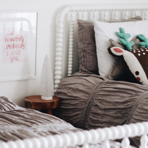 Our living room is long & narrow, and all about function, so we loved the idea of a chaise arm sofa because it took up so much less space than a full sized sectional. We also opted to get rid of our ottoman for the time being, which was basically being used as a trampoline, and with kids, floor space is so much more useful! Coffee tables (or anything with hard corners) are really out of the question for the next few years, so instead we opted for one of our small wooden tree stump tables to be brought into the room. We keep it tucked off to the side when the kids are running around, but can easily move it over to put our feet up or set drinks on once the kids are in bed. We love the way the couch cushions are wide enough for two people, and especially love the end chaise for snuggling! It really is the best seat in the house!