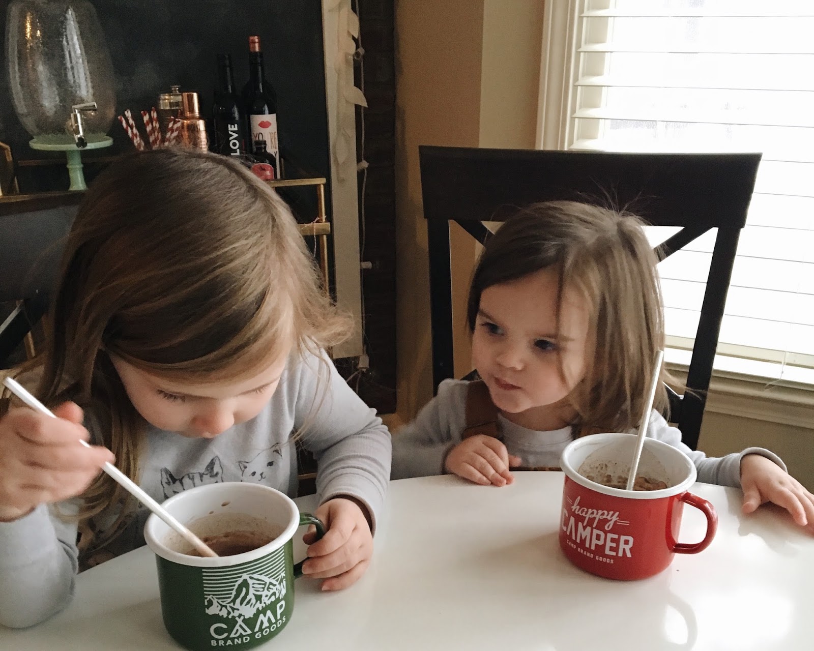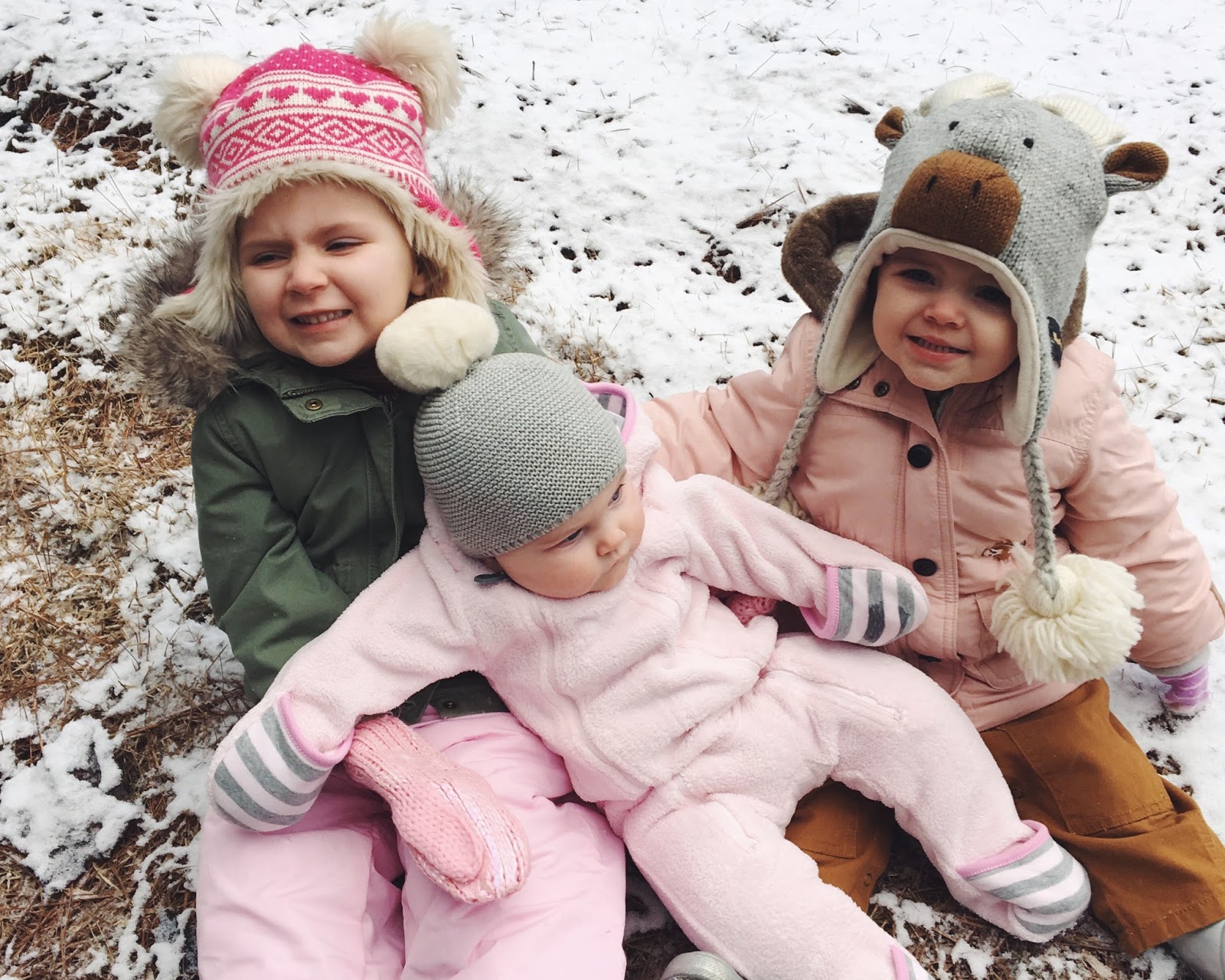 We were so excited to have SNOW this weekend! Harper has been wishing for it since last year’s snowstorm & we were so glad it finally came! Friday night after the girls were in bed, we sat down for a movie & I noticed out the window that the snow was starting to fall. I snapped a quick picture to show the kids in the morning because I wasn’t sure it would still be there when we woke up! But we were pleasantly surprised with a light dusting of snow on the ground, and the girls couldn’t get their little snow suits on fast enough after getting out of bed.
