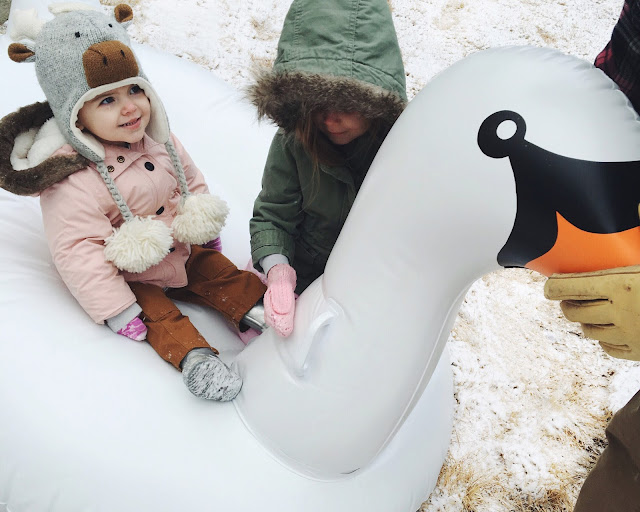 The highlight of the morning was pulling out the swan (who so gracefully hangs upside down from the ceiling in the garage) to use as a sled in the front yard.