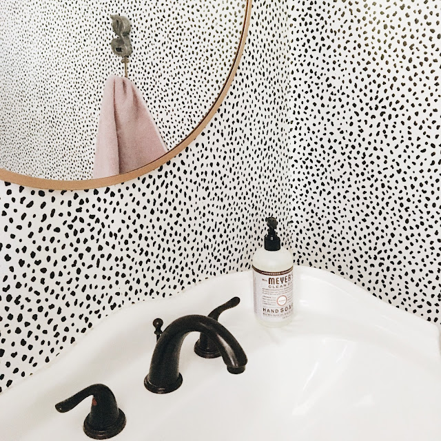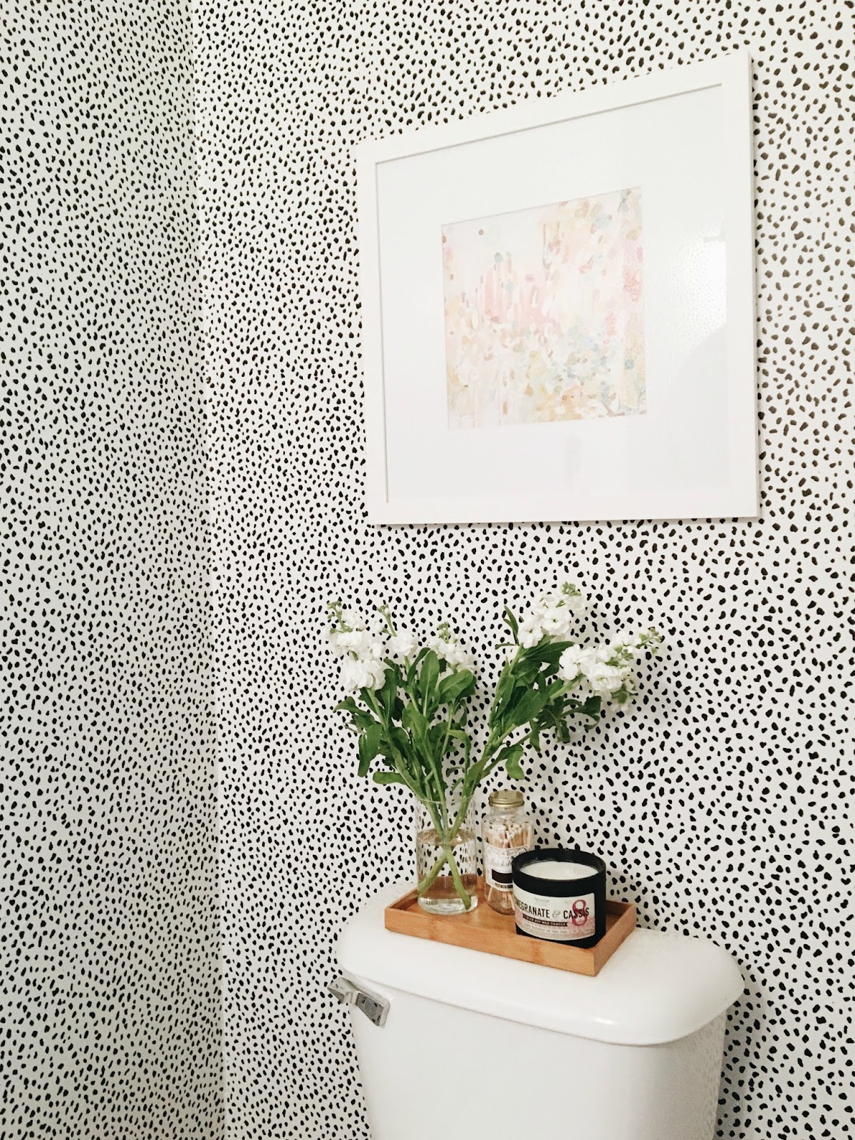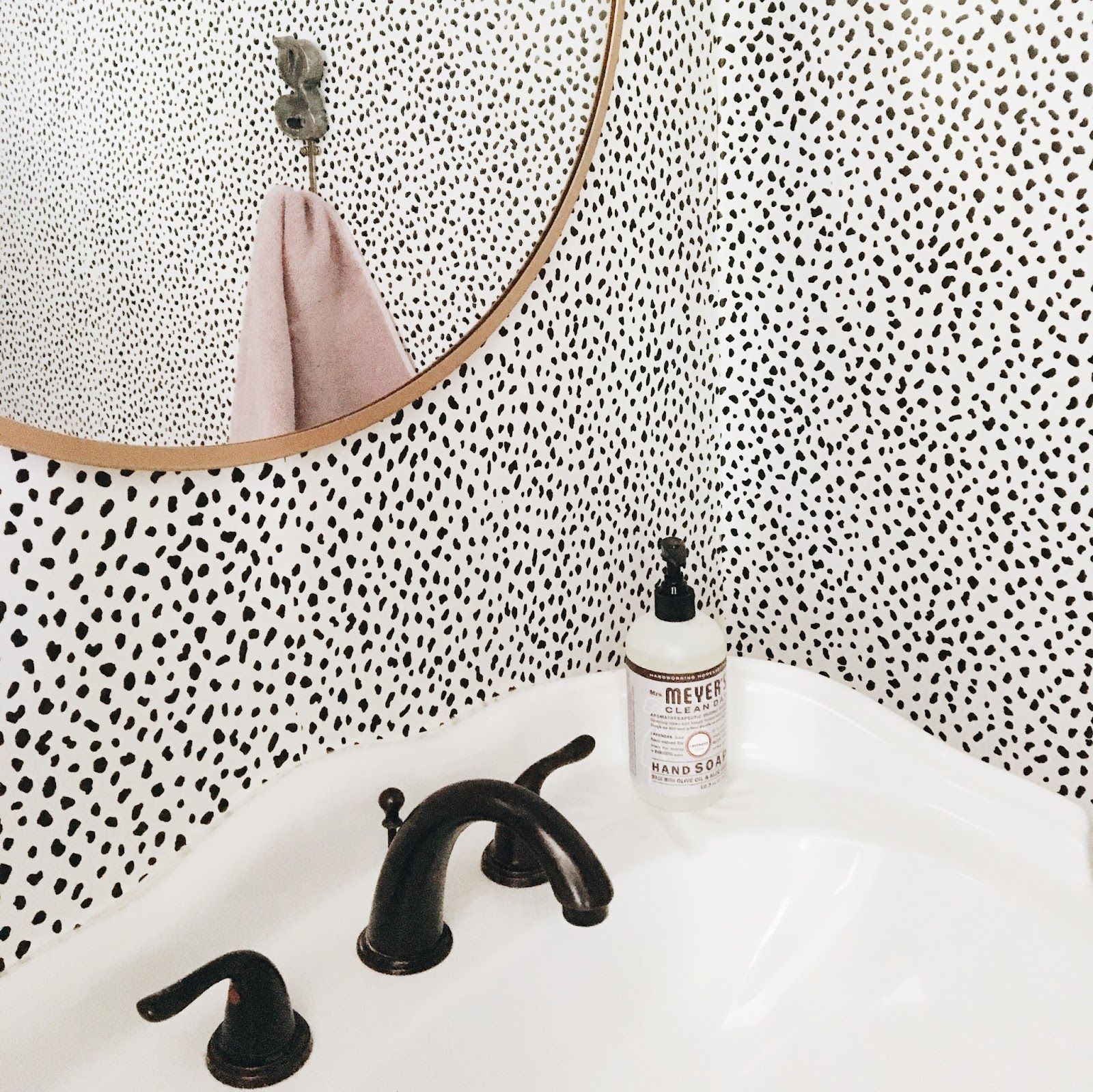 We were super excited to discover a fun alternative to just painting the room, and it’s not your mama’s wallpaper! 😉 You know I can’t resist a good black & white pattern, so this Chasing Paper peel & stick wallpaper had my name written all over it. Since the space is so small, it’s easy to feel like you can go bold, which we certainly did!