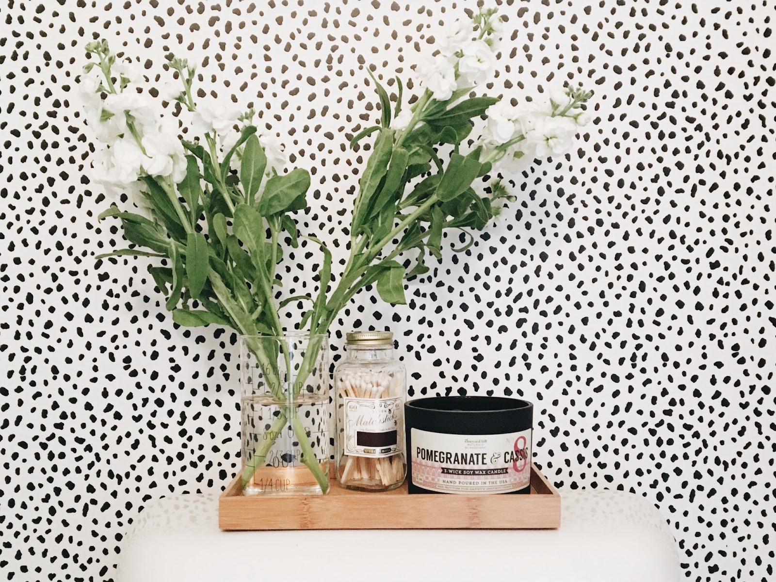 I am so excited to share a super fun DIY project today that we have been working on for the last few weeks. A few years ago, we painted our downstairs powder bathroom a shade of dark navy, which I loved, but we eventually grew a bit tired of. So, after we had the entire main floor painted a few weeks ago, we knew we wanted to give the bathroom a facelift as well. Soooo, we did!!