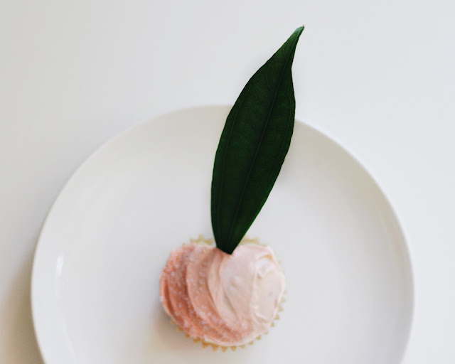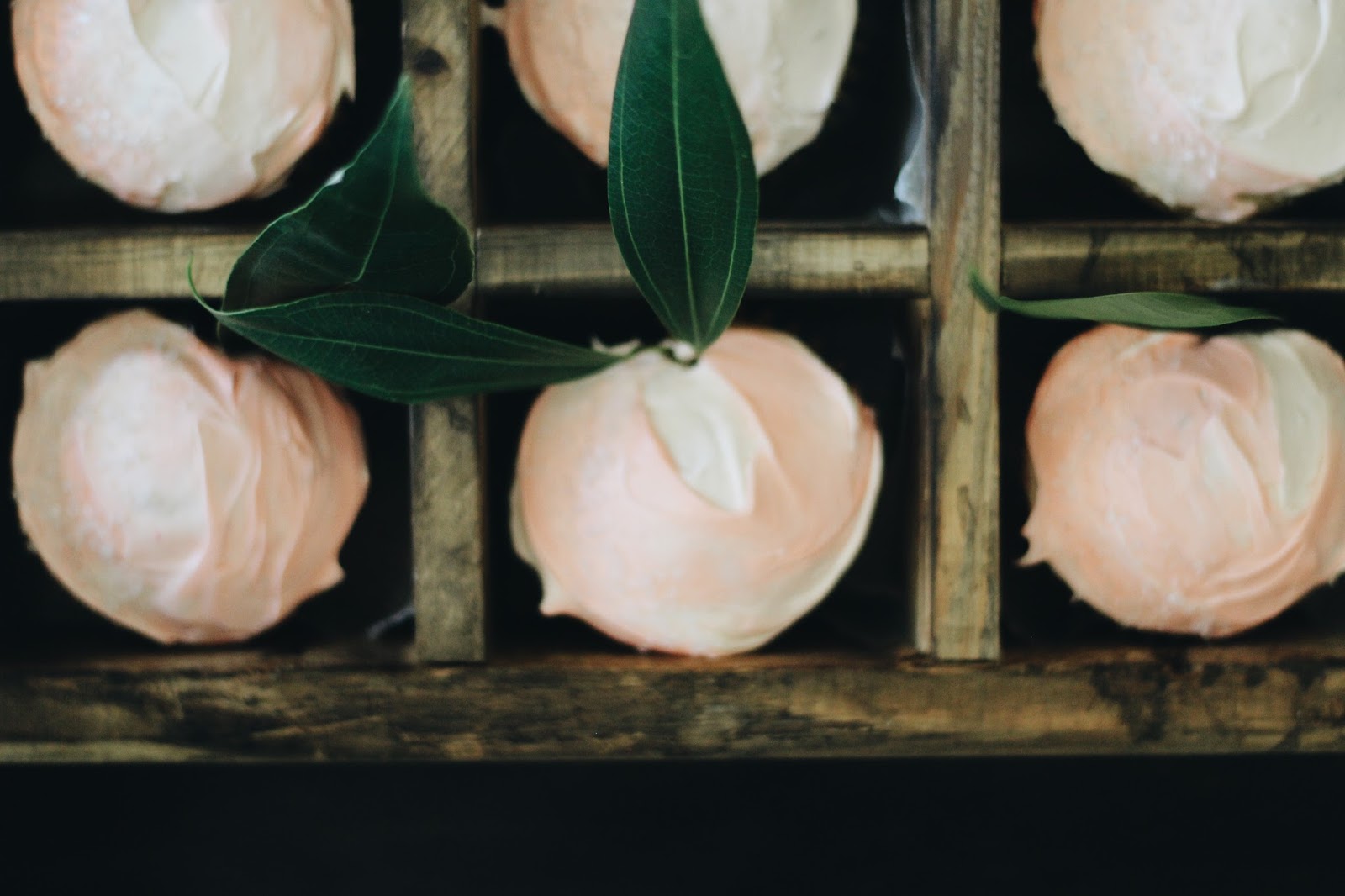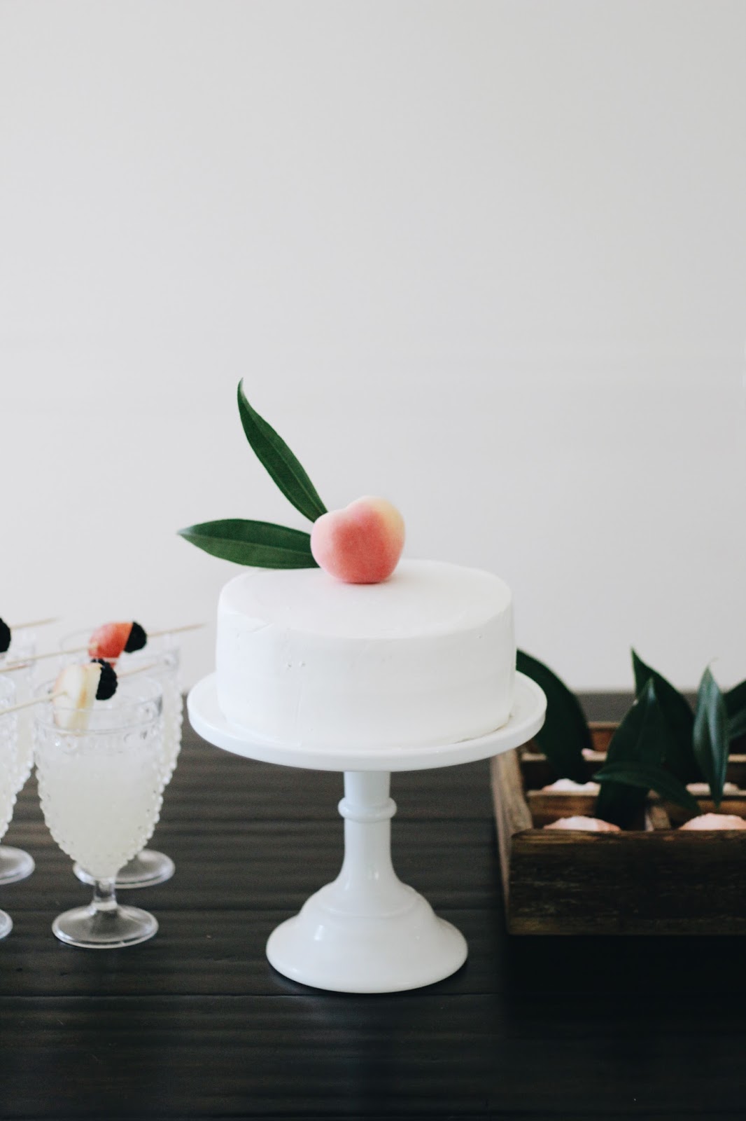 We had a simple peach double layer cake (I used this recipe, but did white frosting instead) & cupcakes for dessert. I saw a tutorial for apple & heart shaped cupcakes on pinterest using a small piece of rolled up aluminum foil that you tuck between the cupcake paper & the cupcake pan to create a slightly different shape for the actual cupcake. I thought this could apply to the peach shape too, so I made the cupcakes this way, frosted them with a few layers of different colored peach frosting, added white sugar sprinkles & garnished with greenery (I asked the whole foods florist if they are okay to put on food, apparently they’re used for wedding cakes all the time). The cupcakes were my favorite part, served in a little wooden crate just like a box of peaches! We served lemonade & pink peach sangria made with Roscato wine, peach sparkling water, sliced white peaches & pears.