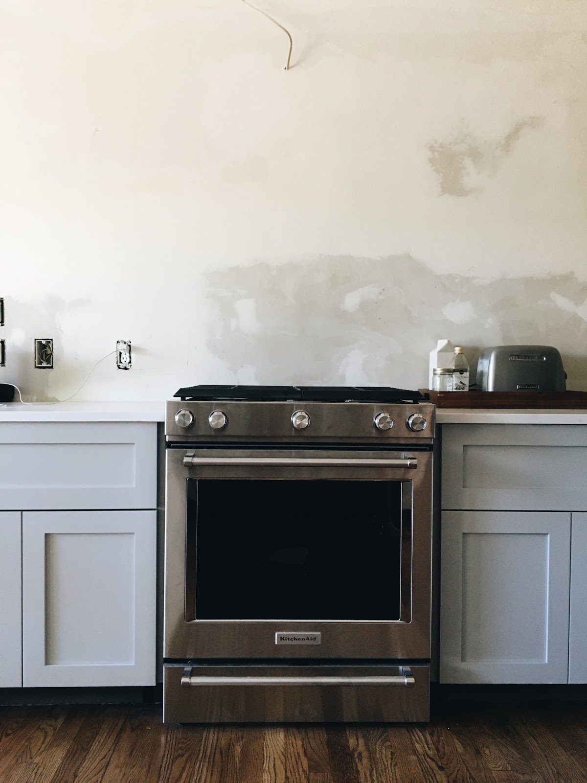 Throughout the process I second guessed myself for choosing Ikea cabinets so many times, it really is such a labor of love, but the price just cannot be beat. The quality is incredible, it has surprised us every step of the way, and it really requires patience you didn’t even know you had (similar to the patience required to potty train a two year old on a road trip). If you have questions about the cabinets or the process, definitely let me know & I would be happy to cover them in another post! 🙂 The custom doors from semihandmade were one of the best decisions we made in this process, the quality & customer service have been amazing, I have had to throw so many questions their way during the process & have been blown away by how helpful they were. The color of the cabinets turned out EXACTLY as I had hoped, I love the subtle green in the grey!! We still need to level the range & install the hood, but this wall is already giving me all the happy feelings!