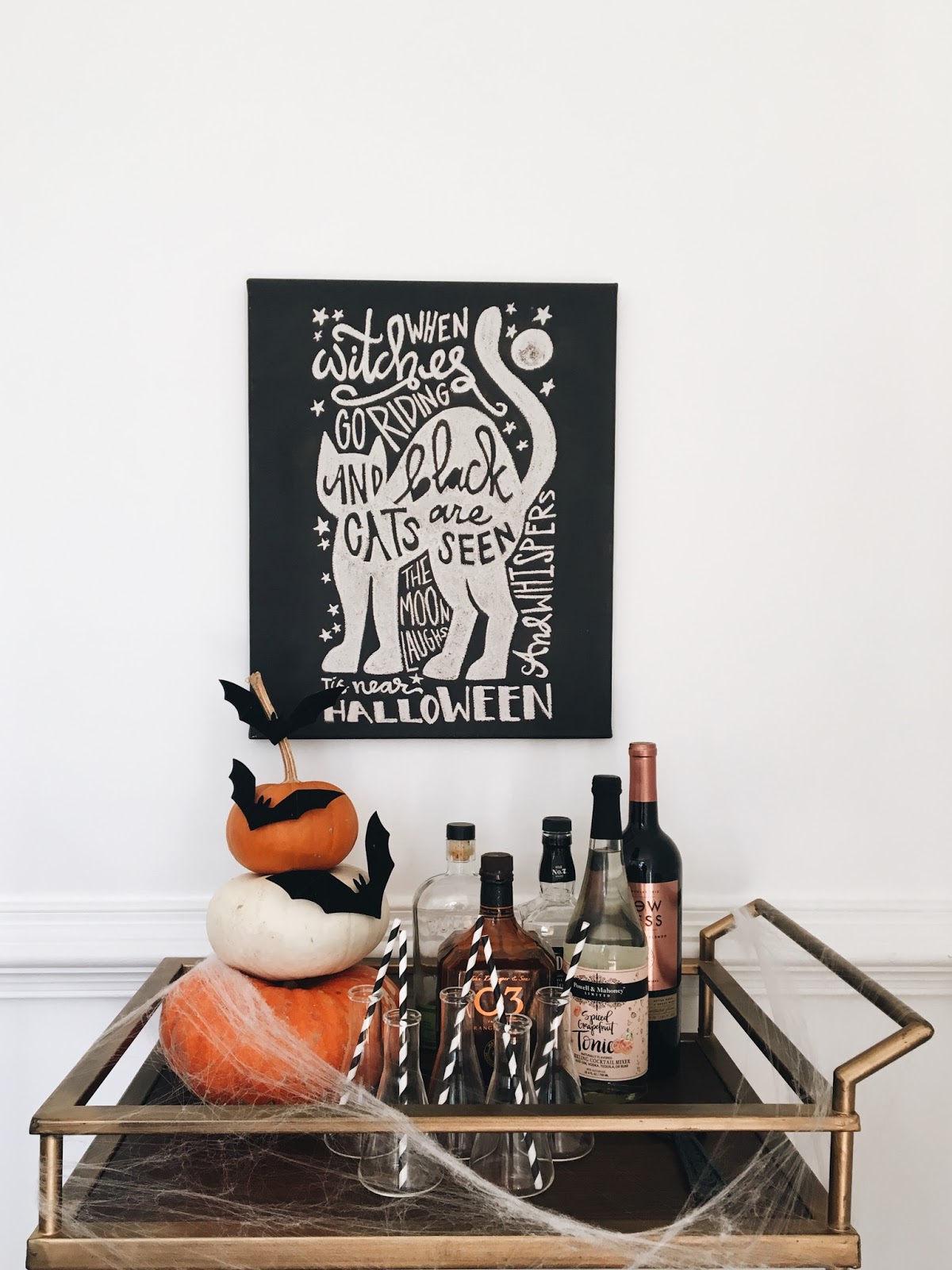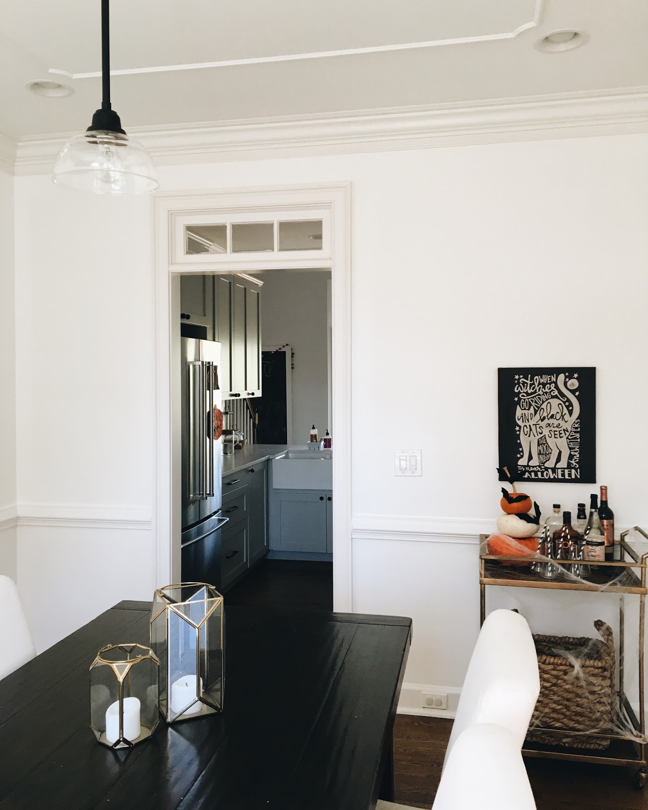Last week I found an antique shaker table on Craigslist for our breakfast nook, and while I really loved our round Ikea table, it wasn’t in the best shape after four years so we switched it out & I love how this table fits the size of the space so much better. I ordered some white chairs to go better with it & can’t wait for them to get here! We still need a coffee table & to finish our gallery wall, but we love the family room so much. The furniture is the Clarice line by Jonathan Louis, both rugs are from RugsUSA & the media console was thrifted. In the dining room, I am working on some letters for the wall but currently loving our Halloween bar cart that we will be using for brunch this weekend!