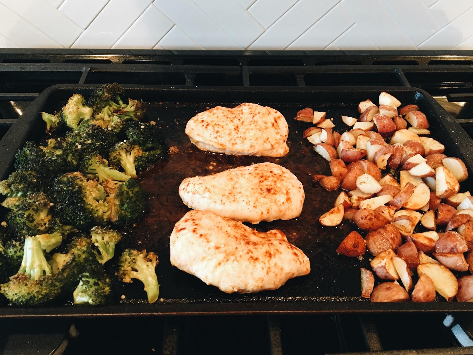 The first is a simple one-pan chicken, potatoes & broccoli. I throw one bag of fresh broccoli (you can buy the steam in a bag stuff, just not frozen), a few handfuls of red potatoes cut into small pieces & 3-4 chicken breasts onto a baking sheet. I drizzle the entire thing in olive oil, and sprinkle on some salt, pepper & paprika (although you could really use any spices you love!). Bake at 425 for 25 min, pulling it out once about halfway through to toss around so everything will cook evenly. Add some fresh parmesan cheese & bake for five minutes, then serve! So easy!! 🙂