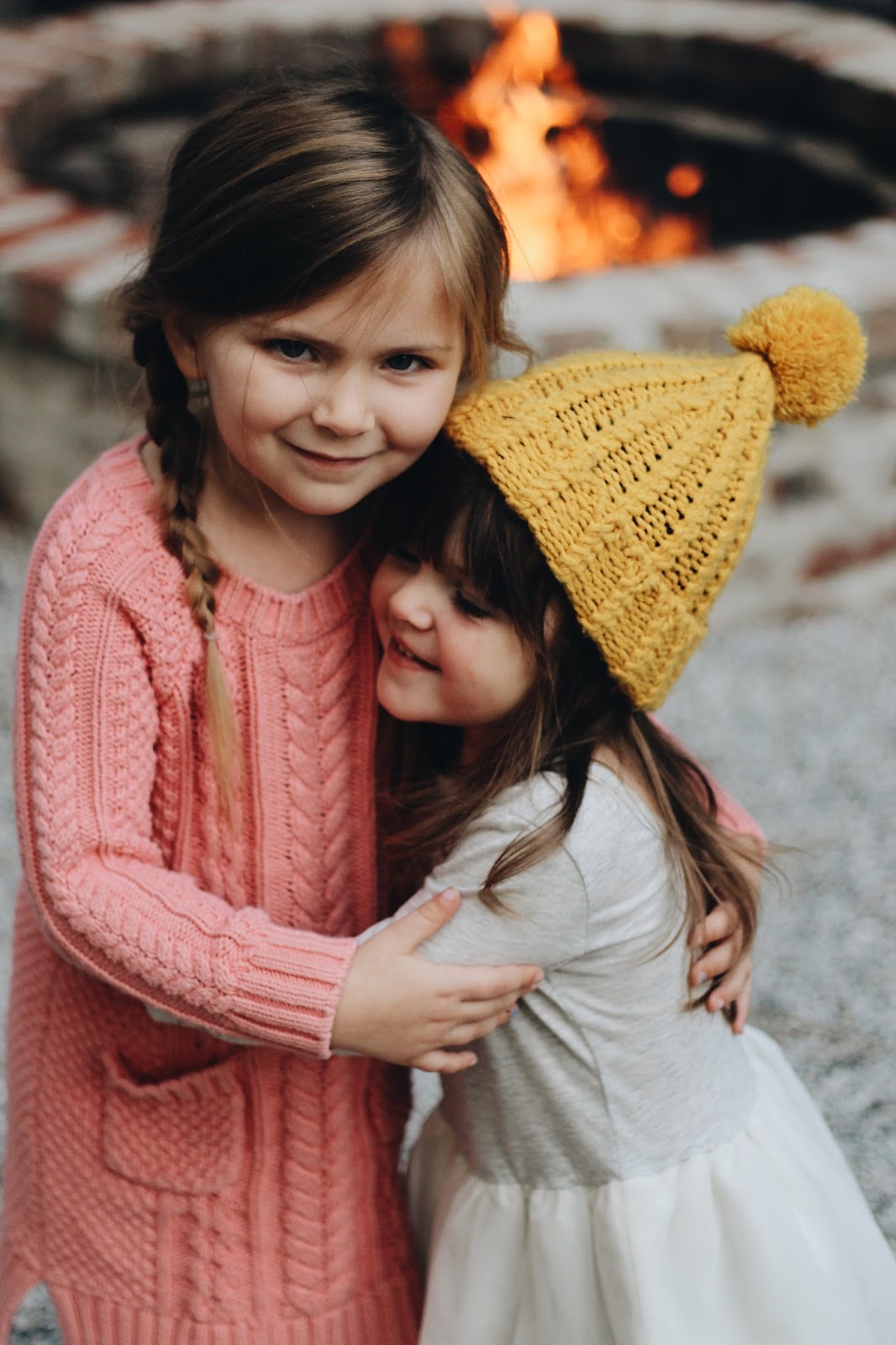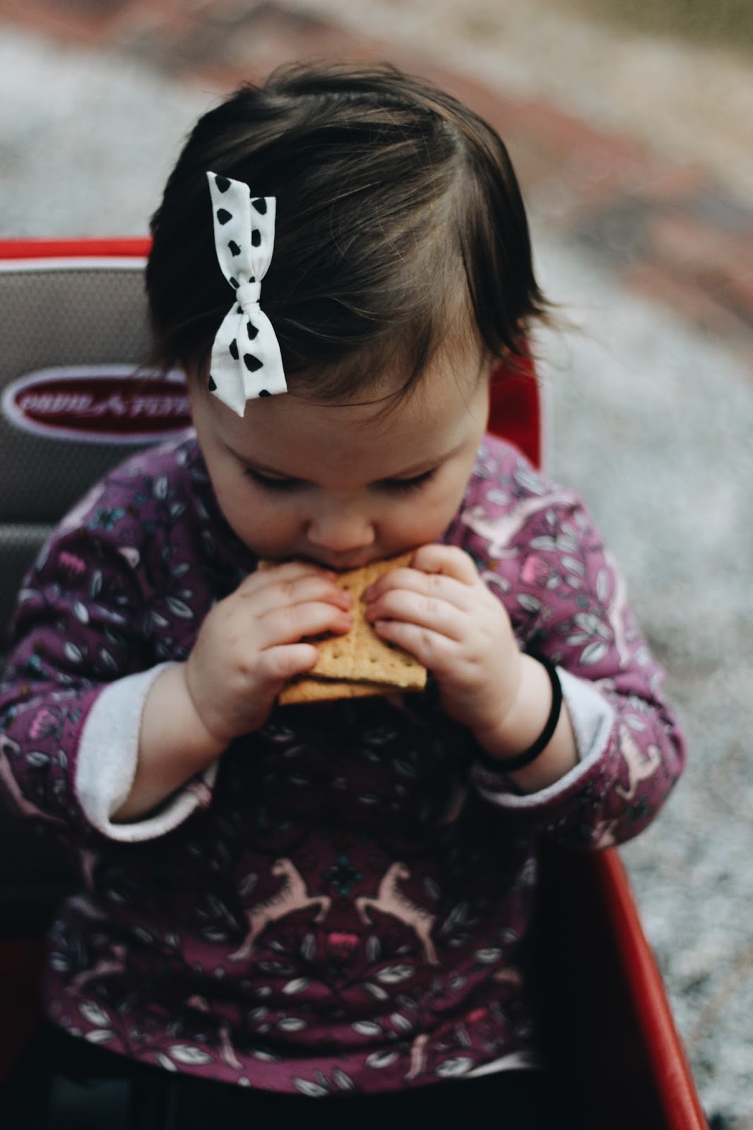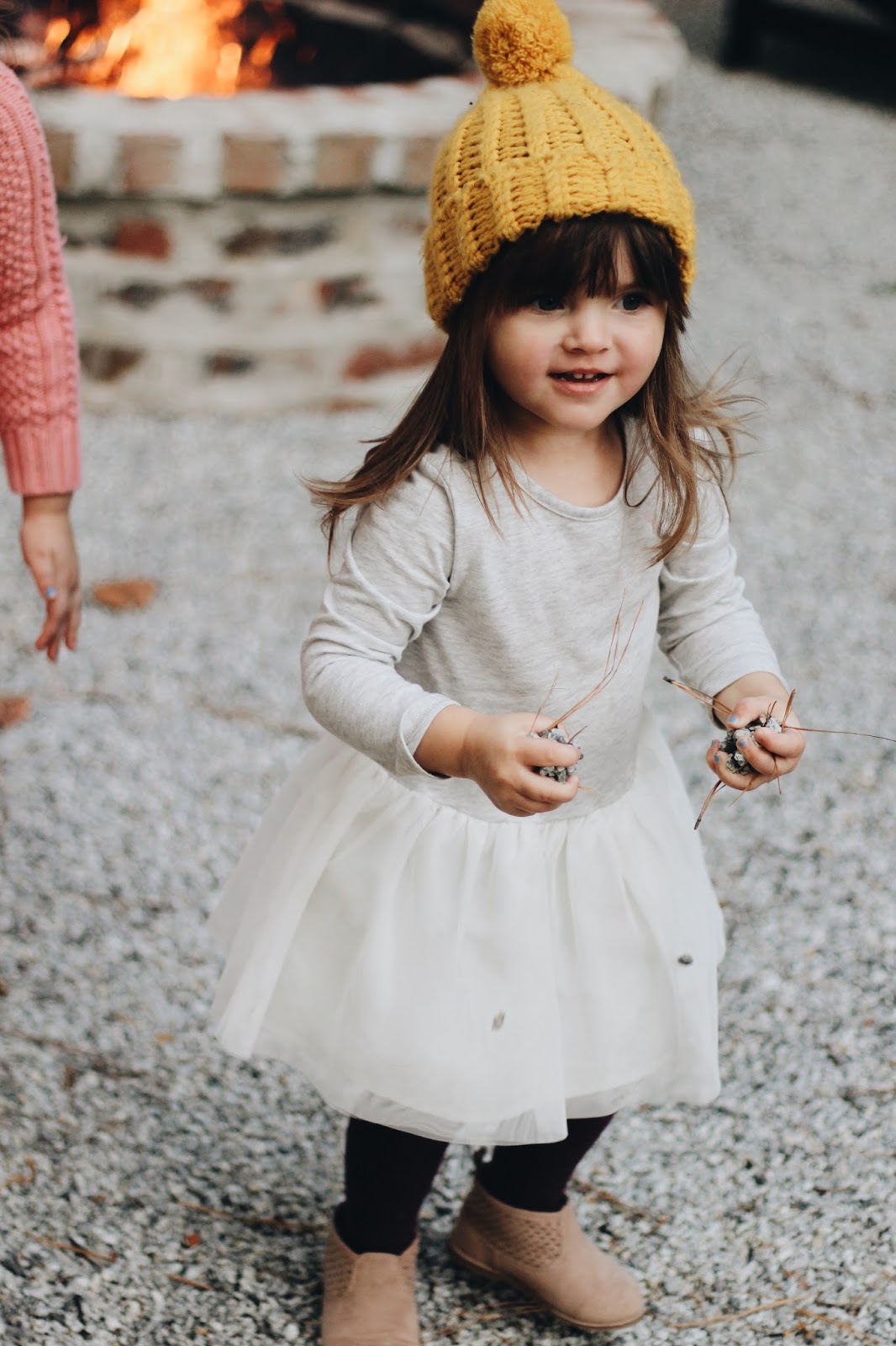 Saturday night, we roasted hot dogs & made s’mores with our super sweet neighbors, who we can’t rave enough about! They have daughters in college right now & have been so welcoming to our little trio of girls who stand at the trees and call their names whenever they see them outside. The girls adore them! Everyone stayed up way past their bedtimes (which I’m sure played a huge part in Eloise falling asleep in her bed so quick!) and it is such a fun flashback to when I was little! We used to roast hot dogs at my grandparent’s farm in Missouri all the time when we visited them, I can vividly remember holding a hot dog on a stick while I rocked with my grandma on the tree swing. What I would give for one more night of that!