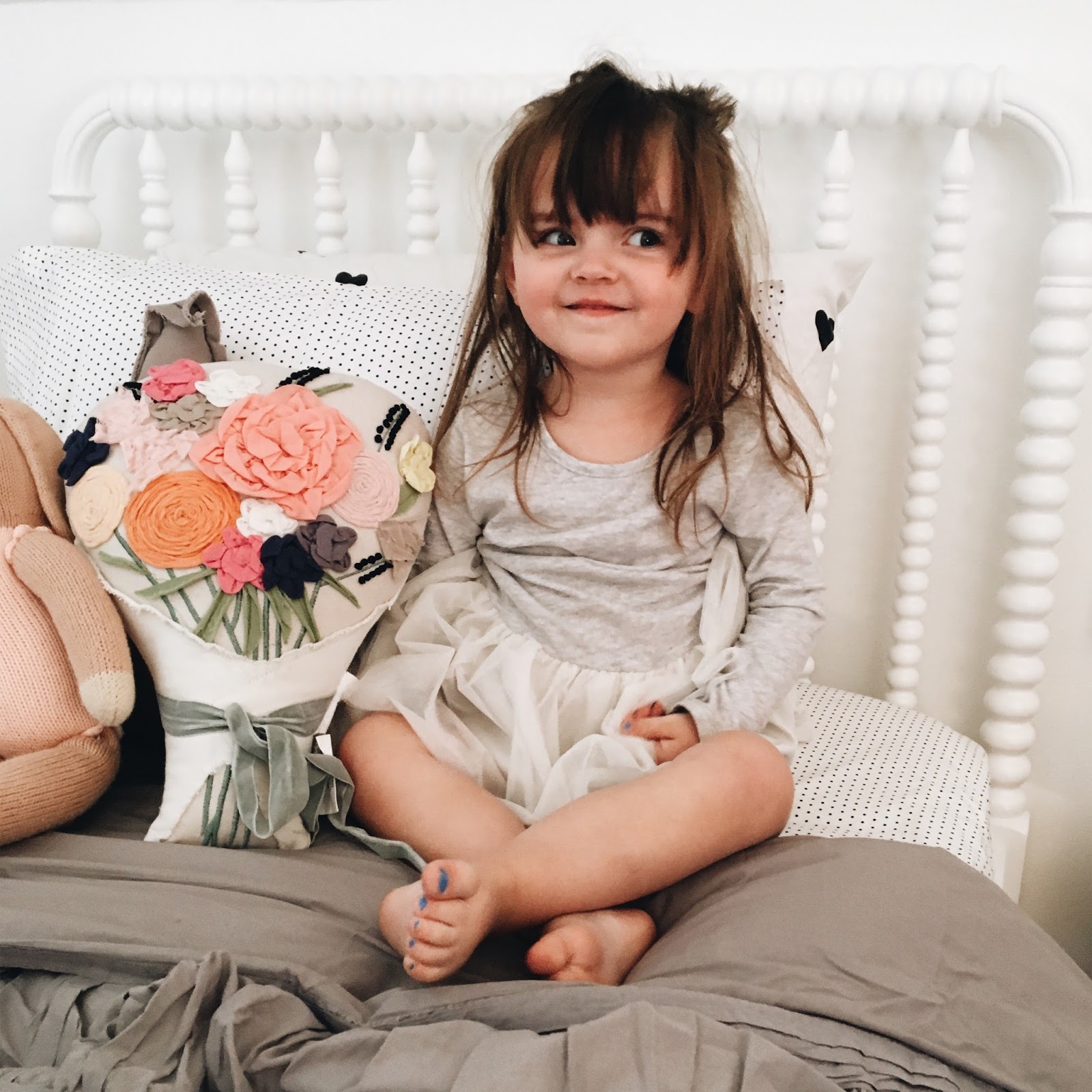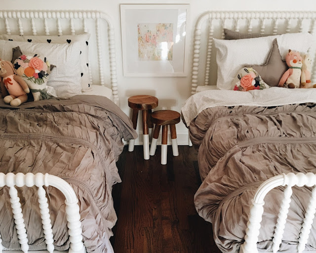 I remember when I first found out that I was pregnant with a second girl, one of the very first images that flashed through my mind was the two of them staying up late in matching twin beds giggling & talking in their room after we put them to bed. It was so sweet to see it actually happen! I will share more of their room very soon, waiting on just a few finishing touches & it will be complete!!