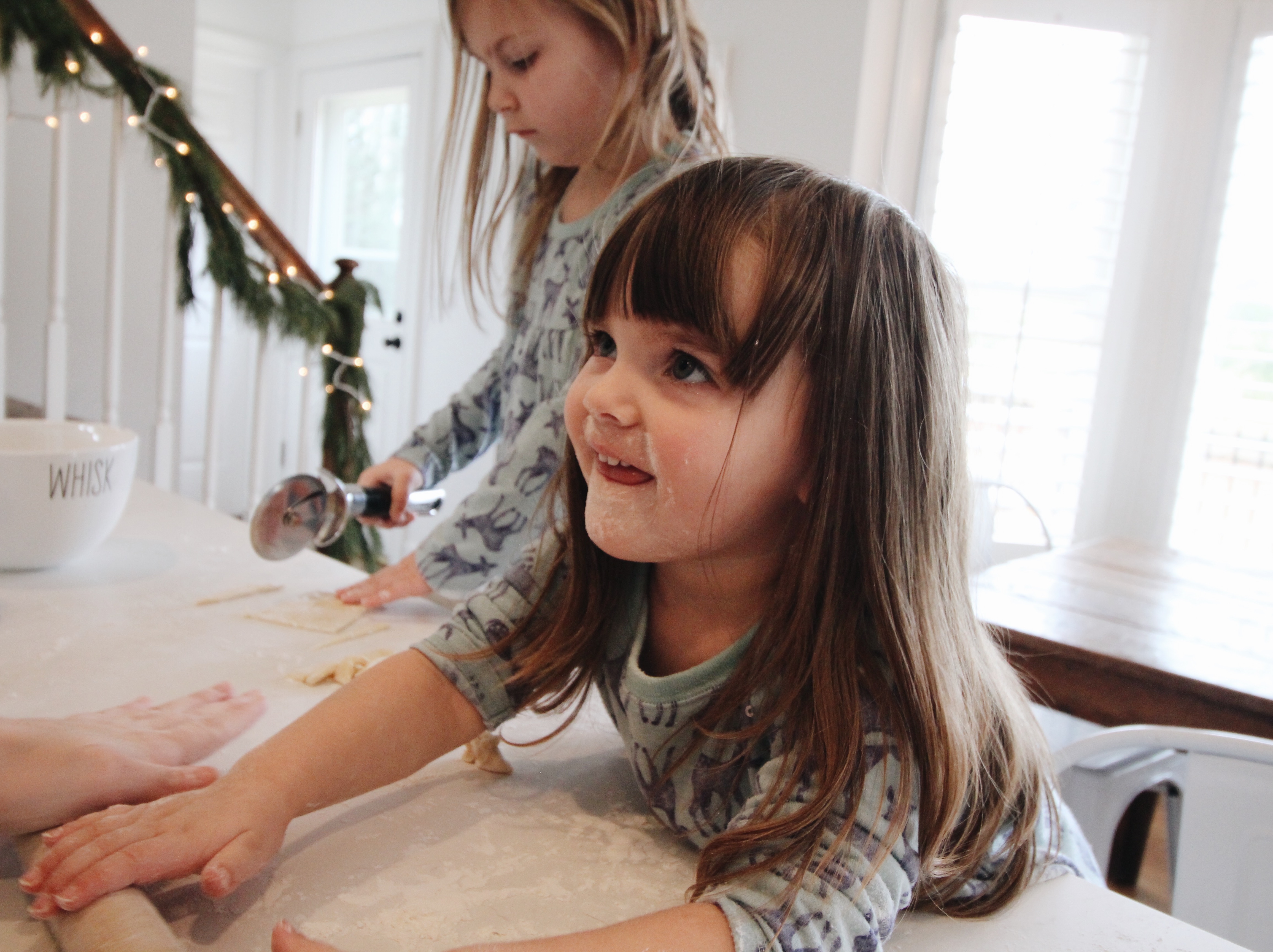 On Christmas Eve, we had some friends over for breakfast & made reindeer pancakes for the kids. Such a fun way to kick off all of the festivities!! We had candlelight service at church & a Christmas party to attend that night, so we decided to make chicken noodle soup for dinner during the day so that it would be ready by the time we got home and we wouldn’t have to cook. Between noodles & the rest of our sugar cookies, our counters (and kids!) were covered in flour for about five straight hours. The girls were so excited all day long, Harper’s class at school made reindeer food (dry oatmeal + glitter) and she has had it in her backpack for over a week just waiting so patiently to get to put it outside. We read the night before Christmas, set out our cookies & milk, and the girls sprinkled their reindeer food off the back deck before going to bed. We got to work in Santa’s workshop for the next few hours before calling it a night, there is no sight quite like the tree lit up & covered in presents on Christmas Eve night!