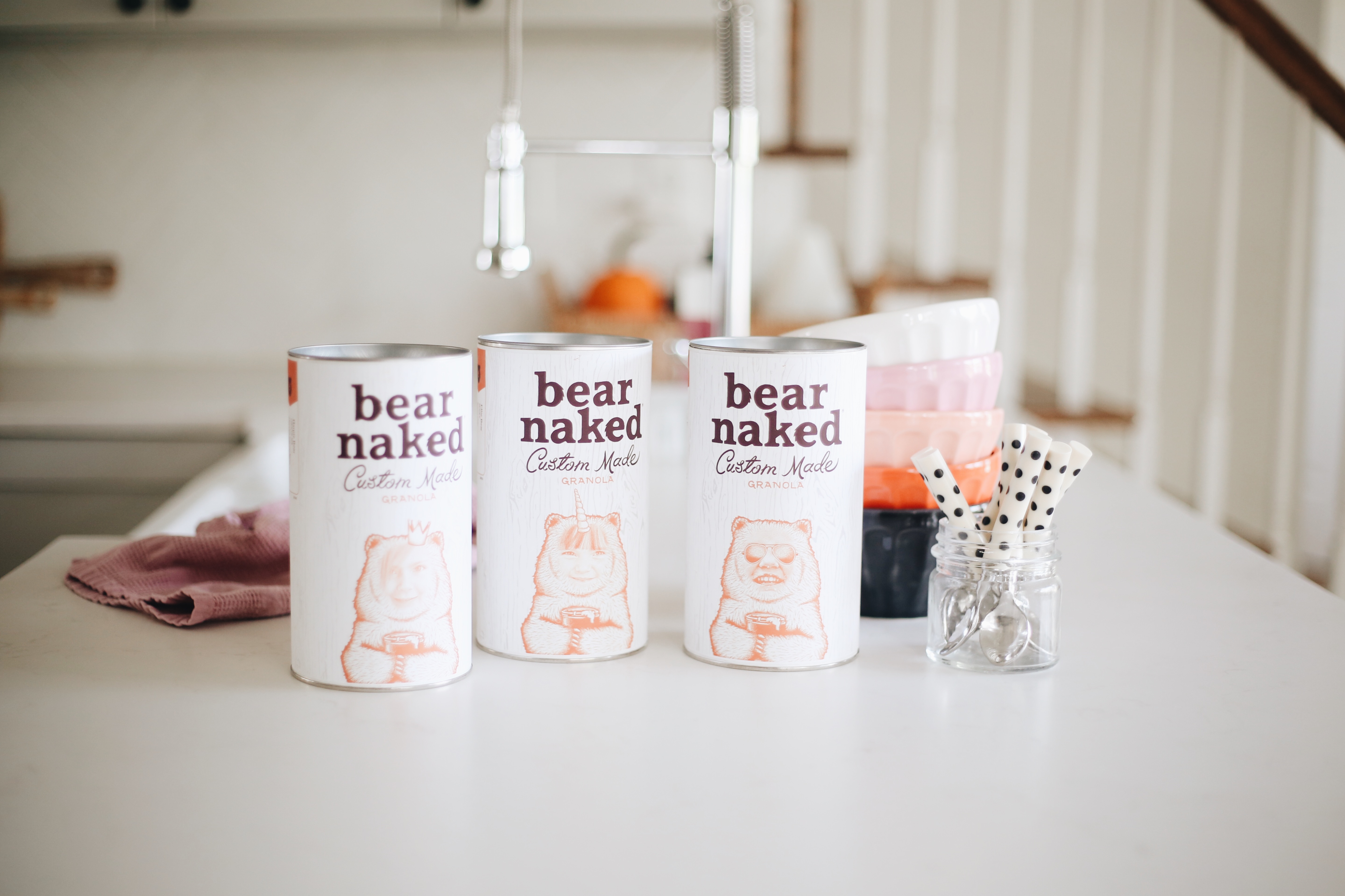 We are so excited to share with you guys one of the most fun snacks of all time! We have partnered with Bear Naked Custom Granola to share their new granola, where you not only get to create your own granola blend (think dark chocolate chunks & freeze dried fruit!), but you get to customize the packaging. We added the girls faces to each of their own blends & named them!