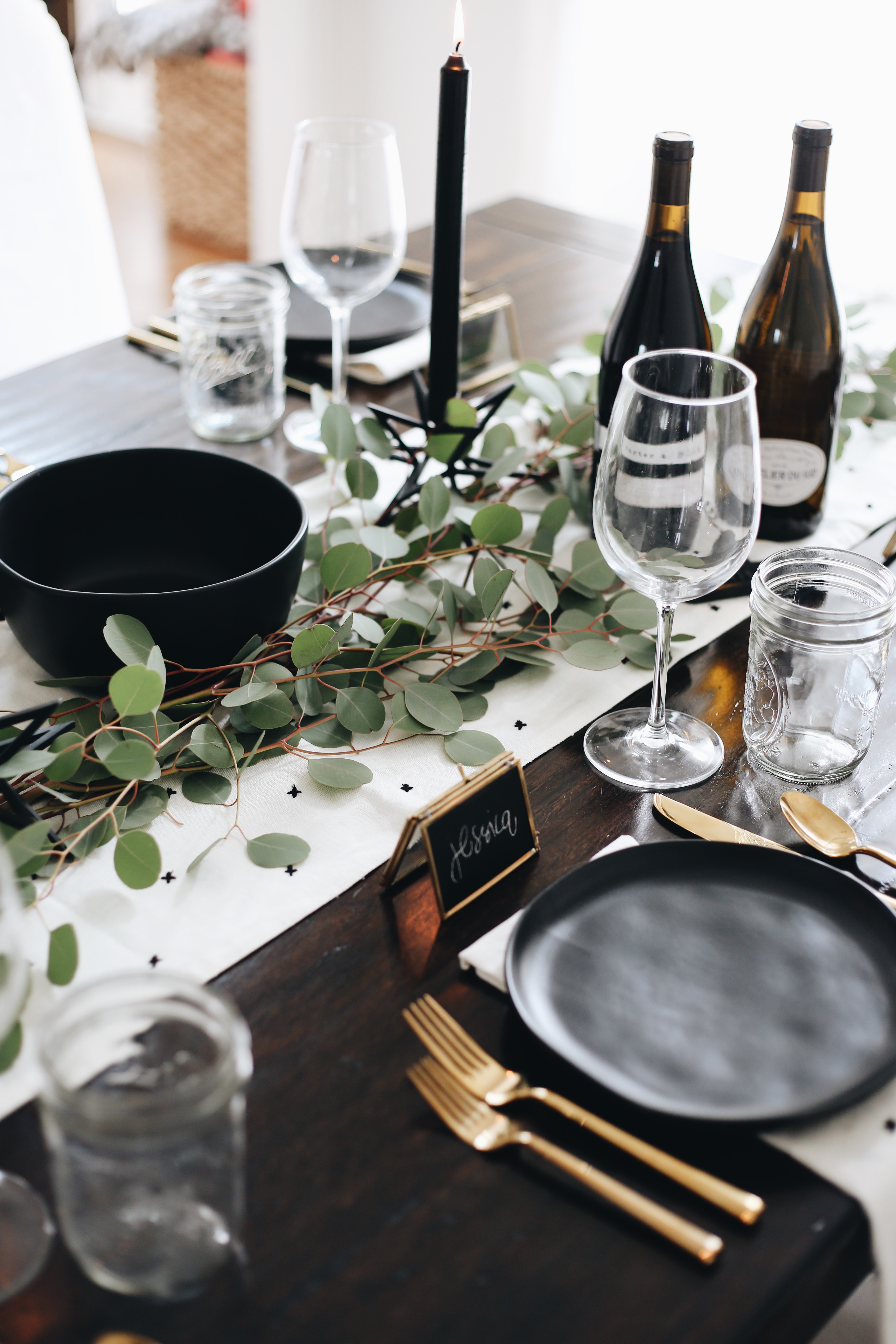 Table Runner // Black Dishes // Gold Flatware // Place Card Holder // Napkins