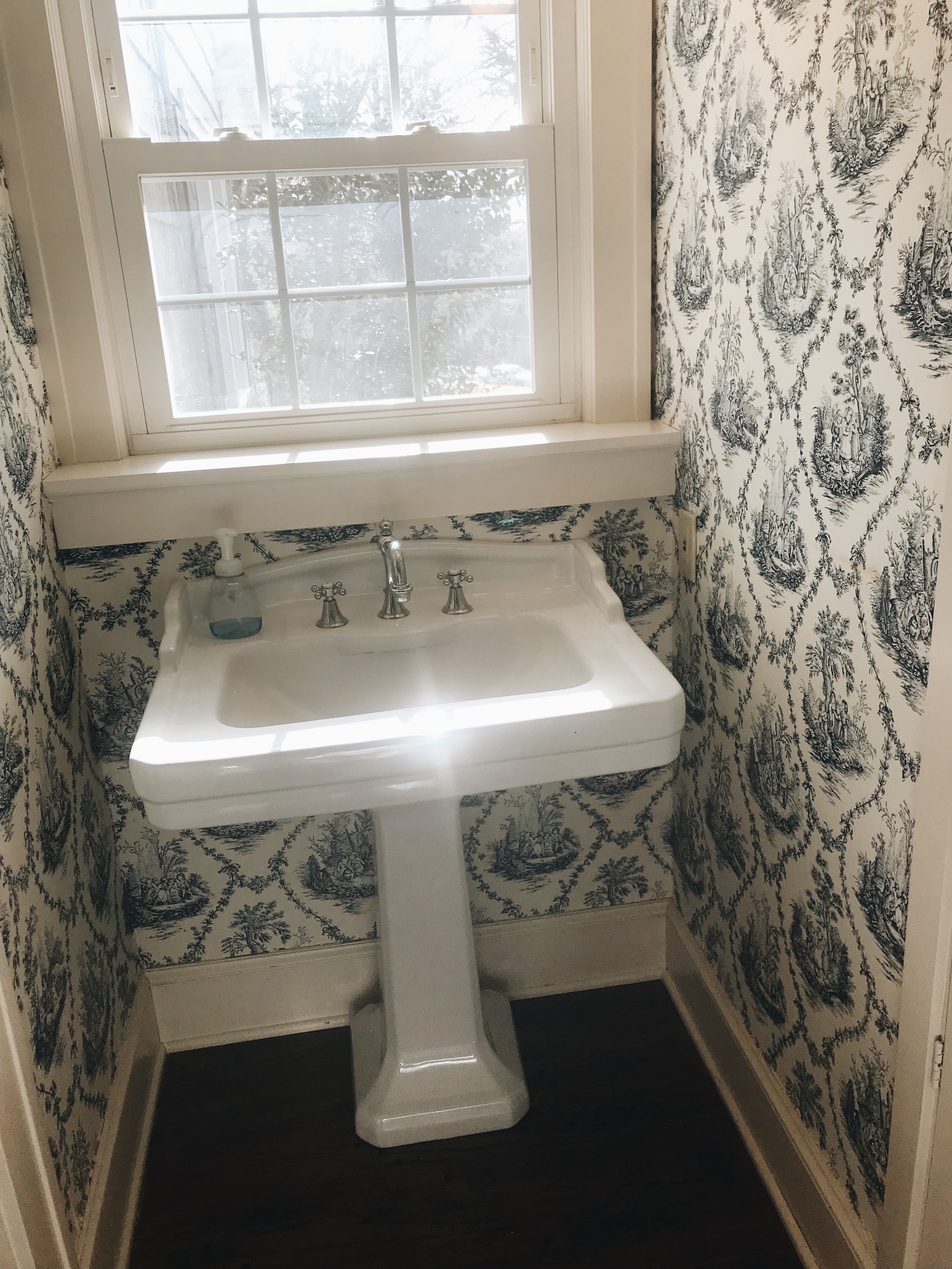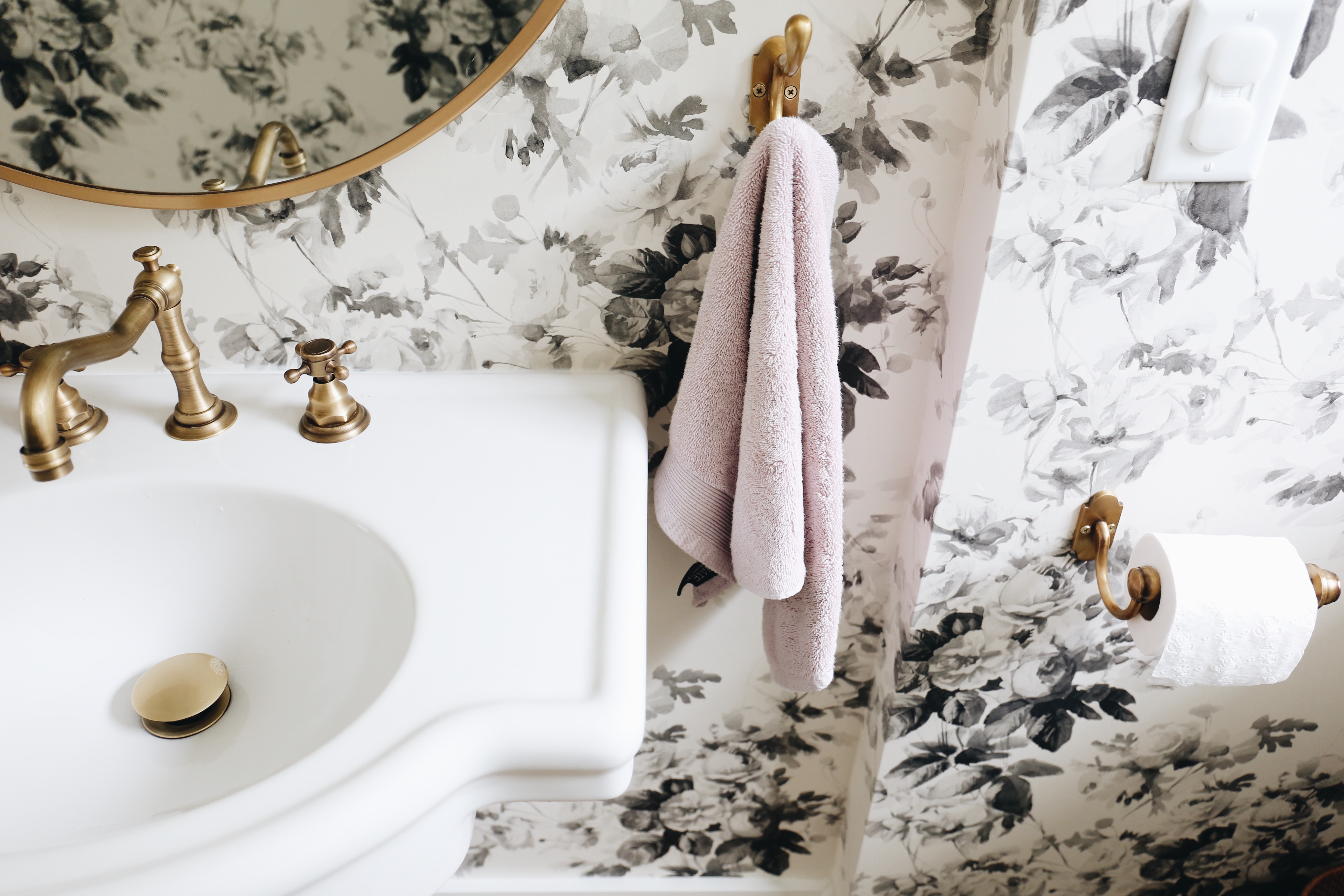 Ahhhh!! Our powder room is the very first room in the house to be completely finished & we are basically in LOVE with how it turned out!!!! We decided to stick with the original plan of using our wallpaper in this room & I am so happy with it! Although I love it so much & might consider wallpapering my entire HOUSE at this point. Eeeek!! It feels just like my grandma’s house & that’s everything I wanted! Now to just keep my kids from coloring on it….