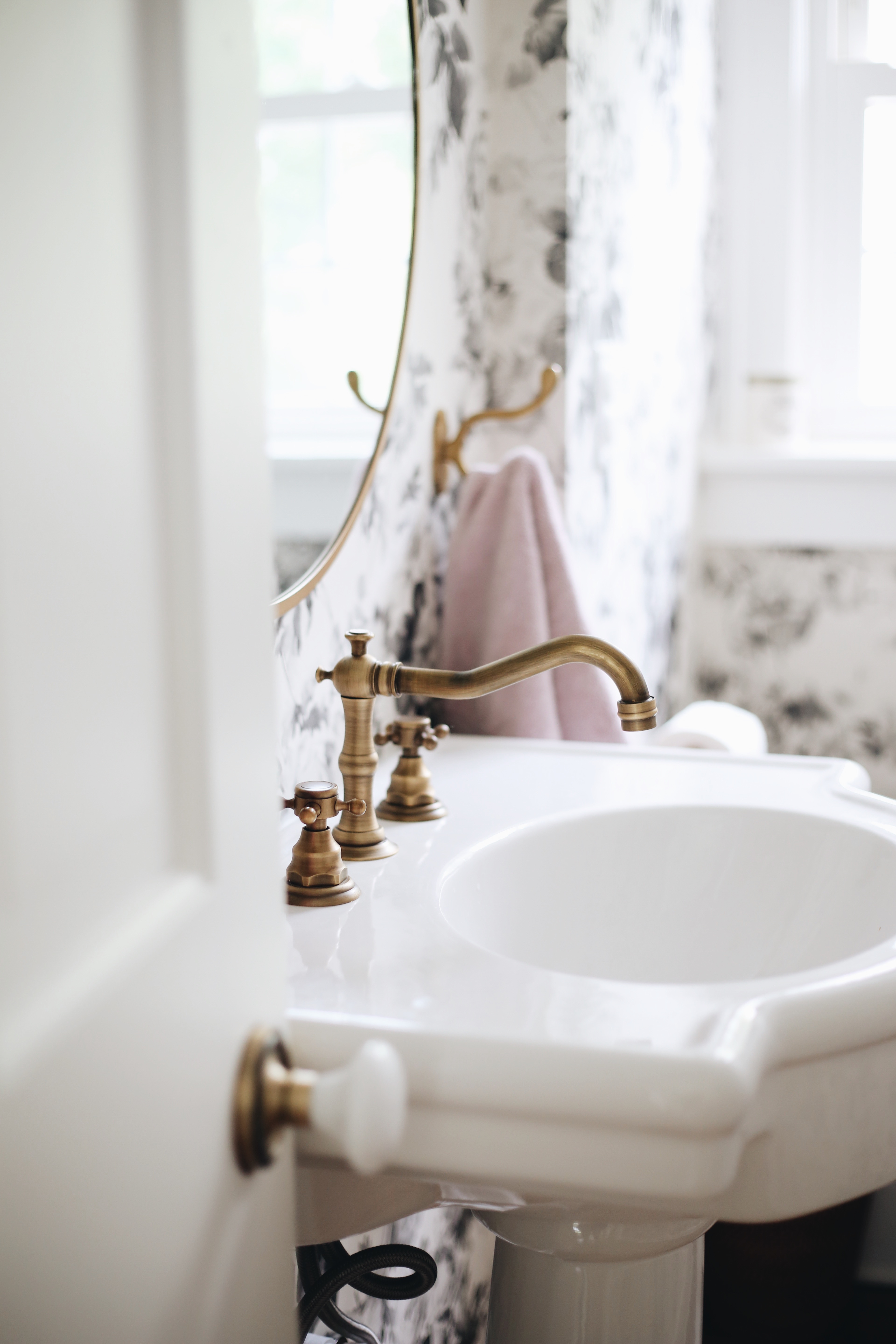 Sources: Wallpaper // Antique Brass Sconce // Round Mirror // Faucet // Pedestal Sink // Toilet Paper Holder // Door Knob
